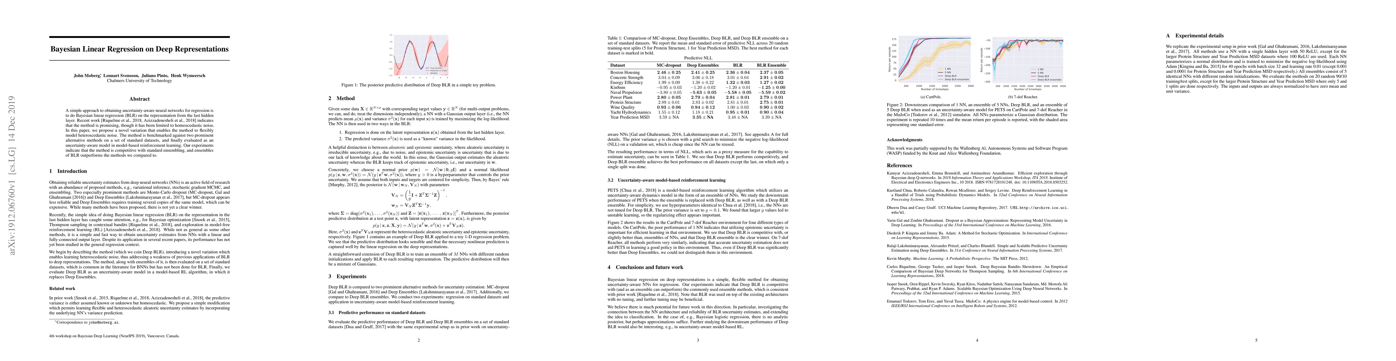 DeepBLR extends previous work on BLR for uncertainty-aware neural networks by incorporating heteroscedastic noise modeling and evaluating it in model-based reinforcement learning.