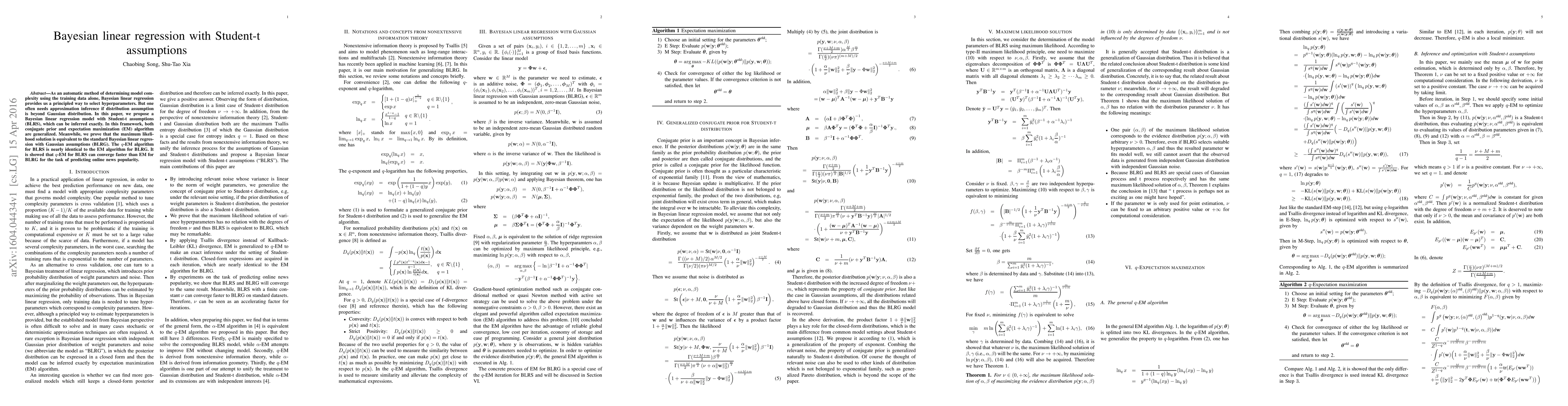 As an automatic method of determining model complexity using the training data alone, Bayesian linear regression provides us a principled way to select hyperparameters. But one often needs approximation inference if distribution assumption is beyond Gaussian distribution. In this paper, we propose a Bayesian linear regression model with Student-t assumptions (BLRS), which can be inferred exactly. In this framework, both conjugate prior and expectation maximization (EM) algorithm are generalized. Meanwhile, we prove that the maximum likelihood solution is equivalent to the standard Bayesian linear regression with Gaussian assumptions (BLRG). The $q$-EM algorithm for BLRS is nearly identical to the EM algorithm for BLRG. It is showed that $q$-EM for BLRS can converge faster than EM for BLRG for the task of predicting online news popularity.