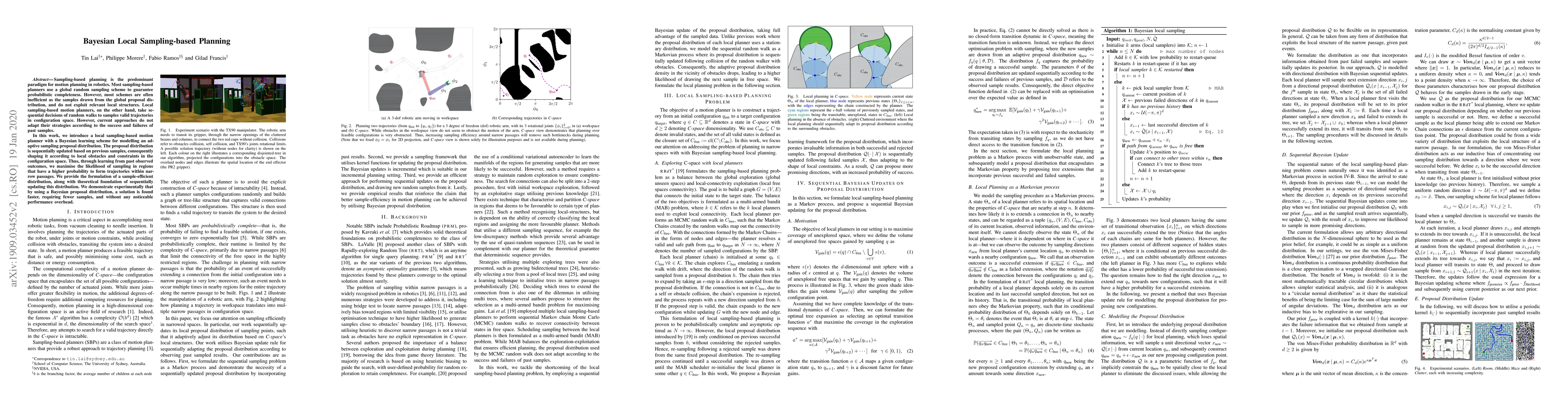 Sampling-based planning is the predominant paradigm for motion planning in robotics. Most sampling-based planners use a global random sampling scheme to guarantee probabilistic completeness. However, most schemes are often inefficient as the samples drawn from the global proposal distribution, and do not exploit relevant local structures. Local sampling-based motion planners, on the other hand, take sequential decisions of random walks to samples valid trajectories in configuration space. However, current approaches do not adapt their strategies according to the success and failures of past samples. In this work, we introduce a local sampling-based motion planner with a Bayesian learning scheme for modelling an adaptive sampling proposal distribution. The proposal distribution is sequentially updated based on previous samples, consequently shaping it according to local obstacles and constraints in the configuration space. Thus, through learning from past observed outcomes, we maximise the likelihood of sampling in regions that have a higher probability to form trajectories within narrow passages. We provide the formulation of a sample-efficient distribution, along with theoretical foundation of sequentially updating this distribution. We demonstrate experimentally that by using a Bayesian proposal distribution, a solution is found faster, requiring fewer samples, and without any noticeable performance overhead.