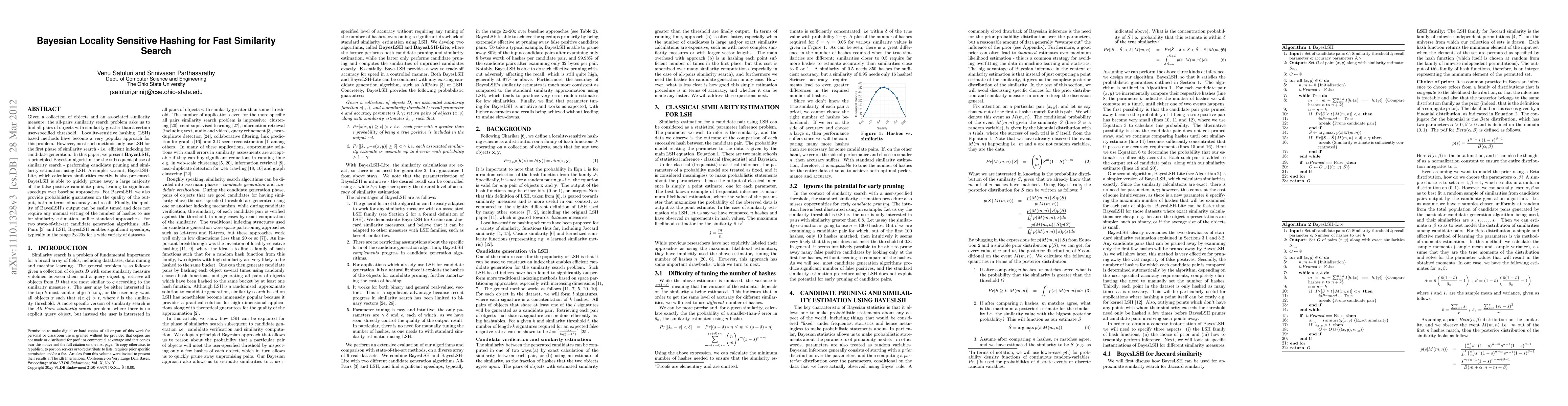 This paper introduces BayesLSH, a Bayesian algorithm for efficient similarity search by pruning false positives using LSH, providing probabilistic guarantees on accuracy and recall. A simpler variant, BayesLSH-Lite, calculates exact similarities. It demonstrates significant speedups (2x-20x) over baselines.