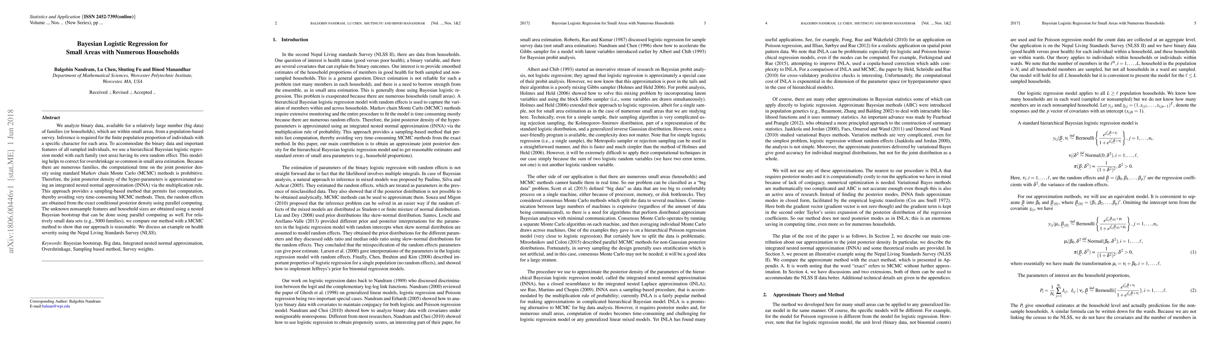 This paper proposes a Bayesian logistic regression model for estimating proportions in small areas using big data from household surveys. It employs an integrated nested normal approximation for fast computation, avoiding traditional MCMC methods, and uses parallel computing for efficient random effect estimation and nested Bayesian bootstrap.