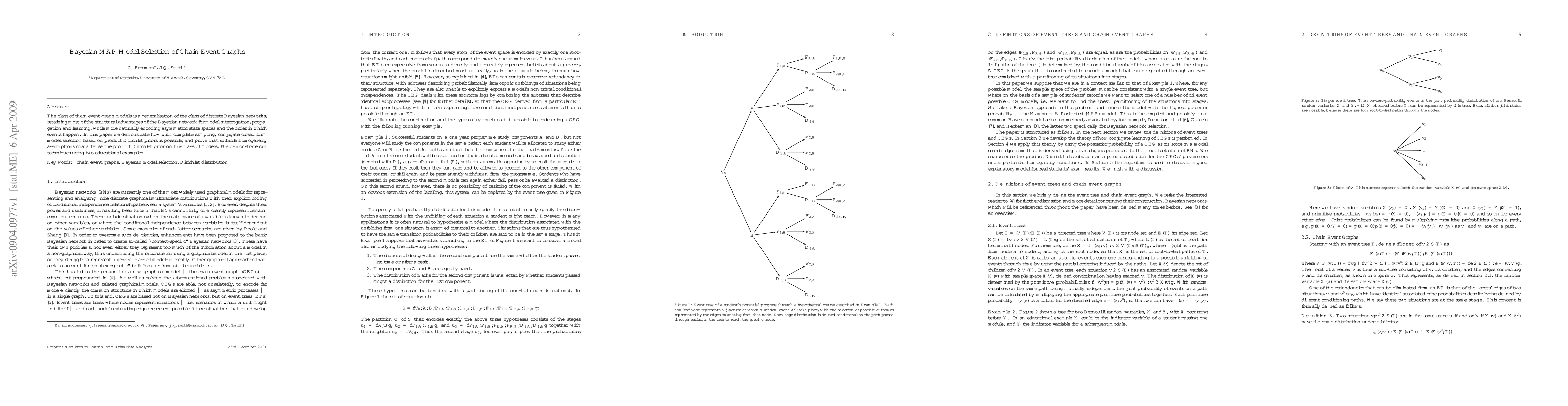 This paper presents a method for selecting the best chain event graph models using Bayesian Maximum A Posteriori (MAP) estimation with complete sampling and conjugate priors. It proves that product Dirichlet priors are suitable for this class of models under certain homogeneity assumptions, and applies the technique to two educational examples.