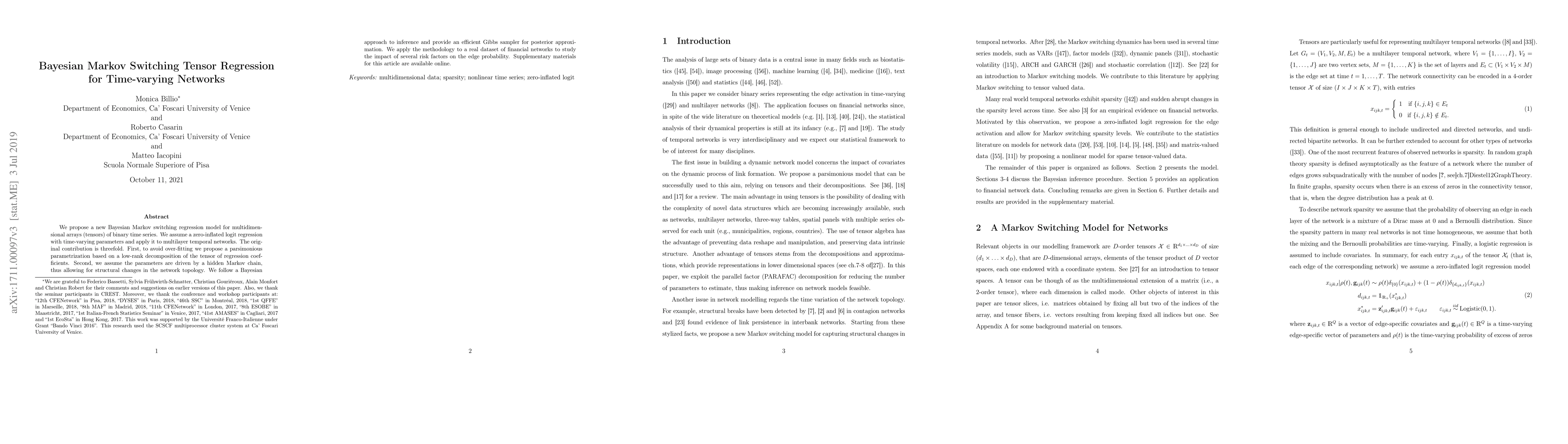 We propose a new Bayesian Markov switching regression model for multidimensional arrays (tensors) of binary time series. We assume a zero-inflated logit regression with time-varying parameters and apply it to multilayer temporal networks. The original contribution is threefold. First, to avoid over-fitting we propose a parsimonious parametrization based on a low-rank decomposition of the tensor of regression coefficients. Second, we assume the parameters are driven by a hidden Markov chain, thus allowing for structural changes in the network topology. We follow a Bayesian approach to inference and provide an efficient Gibbs sampler for posterior approximation. We apply the methodology to a real dataset of financial networks to study the impact of several risk factors on the edge probability. Supplementary materials for this article are available online.