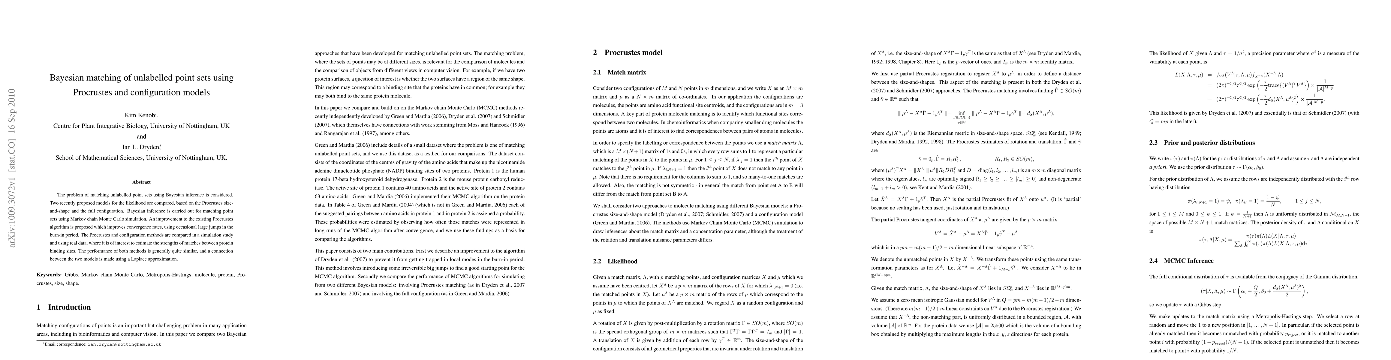 This paper compares two Bayesian models for matching unlabeled point sets, based on Procrustes size-and-shape and full configuration methods. It proposes an improvement to the Procrustes algorithm using large jumps in MCMC simulation, and finds both methods perform similarly in simulations and real-world data analysis, such as protein binding site matching. A Laplace approximation connects the models.