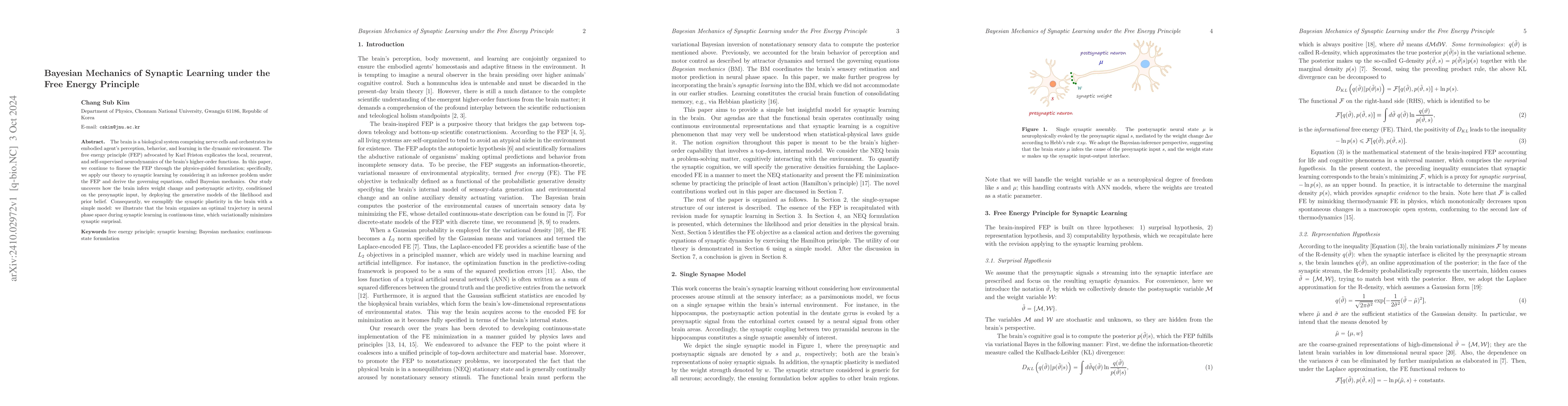 The brain is a biological system comprising nerve cells and orchestrates its embodied agent's perception, behavior, and learning in the dynamic environment. The free energy principle (FEP) advocated by Karl Friston explicates the local, recurrent, and self-supervised neurodynamics of the brain's higher-order functions. In this paper, we continue to finesse the FEP through the physics-guided formulation; specifically, we apply our theory to synaptic learning by considering it an inference problem under the FEP and derive the governing equations, called Bayesian mechanics. Our study uncovers how the brain infers weight change and postsynaptic activity, conditioned on the presynaptic input, by deploying the generative models of the likelihood and prior belief. Consequently, we exemplify the synaptic plasticity in the brain with a simple model: we illustrate that the brain organizes an optimal trajectory in neural phase space during synaptic learning in continuous time, which variationally minimizes synaptic surprisal.