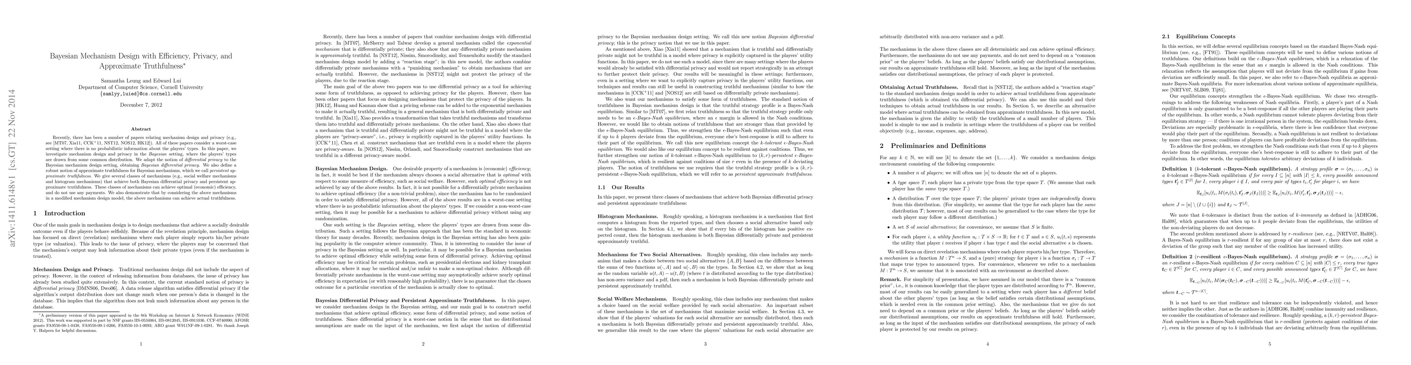 This paper explores Bayesian mechanism design that balances efficiency, privacy, and approximate truthfulness. It introduces Bayesian differential privacy and persistent approximate truthfulness, providing classes of mechanisms that achieve these goals without payments, while also demonstrating their potential for actual truthfulness in a modified model.