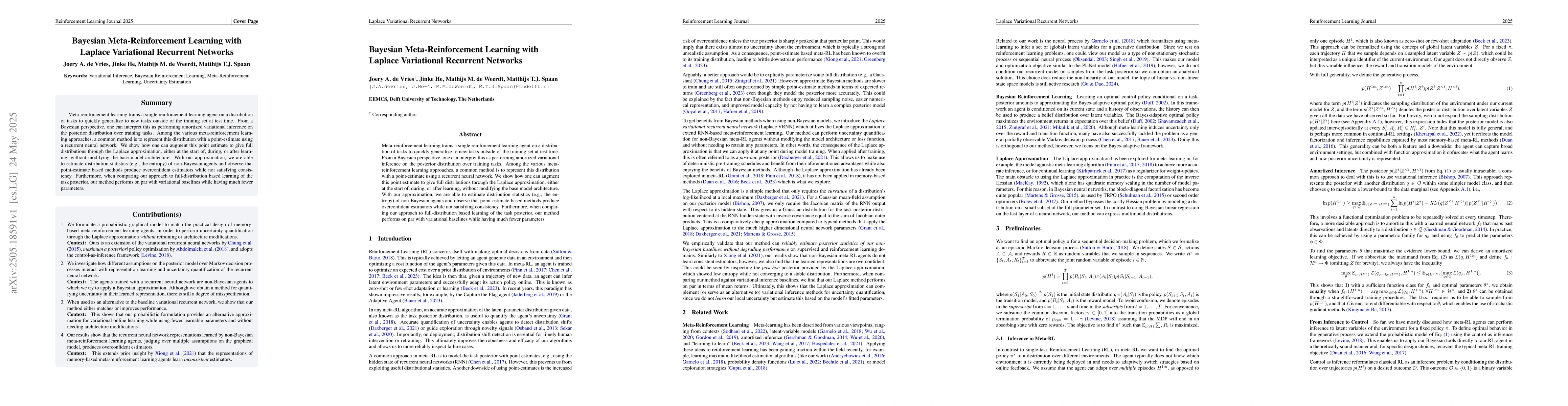 This paper proposes a Bayesian meta-reinforcement learning method that approximates the posterior distribution over training tasks using Laplace variational recurrent networks, outperforming point-estimate based methods while requiring fewer parameters.