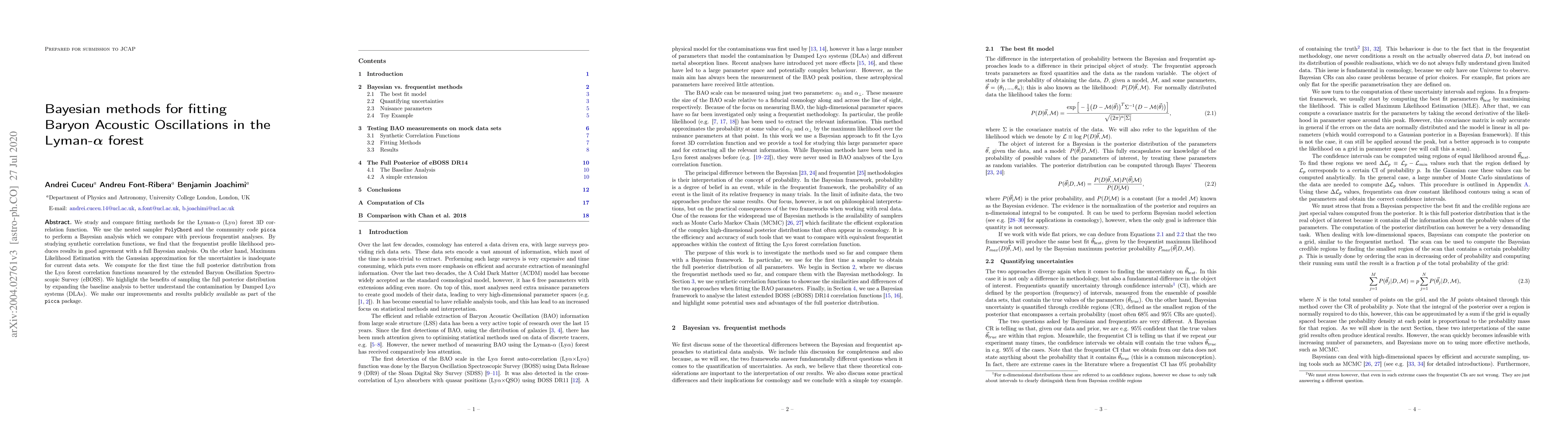 This paper compares Bayesian and frequentist methods for analyzing the 3D correlation function in the Lyman-$\alpha$ forest, finding that while frequentist methods agree well with full Bayesian analysis, Maximum Likelihood Estimation is inadequate. The authors compute the full posterior distribution for the first time using the eBOSS data, highlighting the benefits of Bayesian methods in understanding contamination by Damped Ly$\alpha$ systems.
