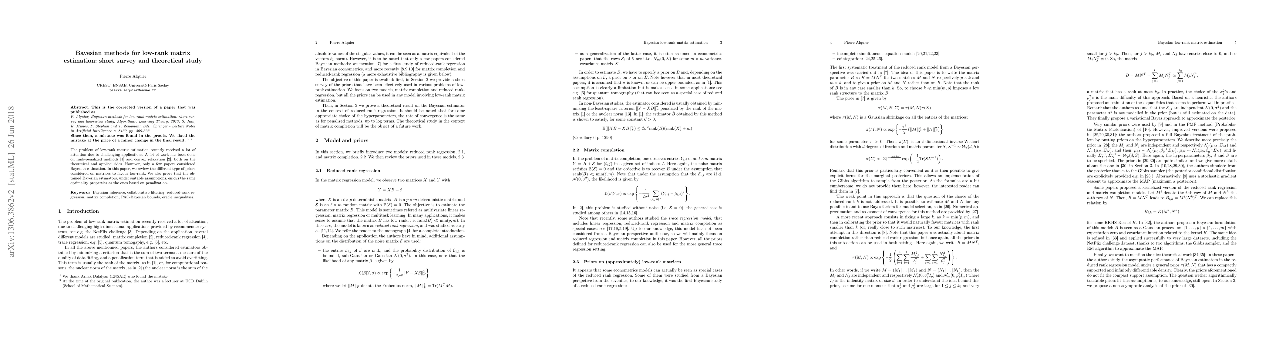 This paper reviews Bayesian methods for low-rank matrix estimation, focusing on various priors that favor low-rank structures. It demonstrates that these Bayesian estimators possess the same optimality properties as rank-penalized methods under certain conditions.