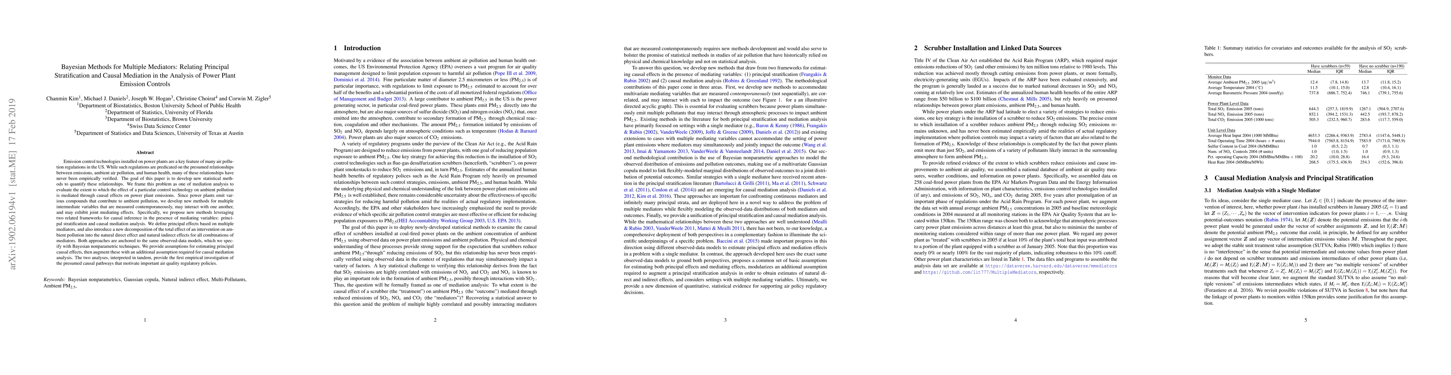 This paper develops Bayesian methods for analyzing the causal mediation effects of multiple simultaneous mediators in power plant emission control technologies. It combines principal stratification and causal mediation analysis to quantify the relationships between emissions, ambient pollution, and human health, offering a new decomposition of total effects into direct and indirect components.