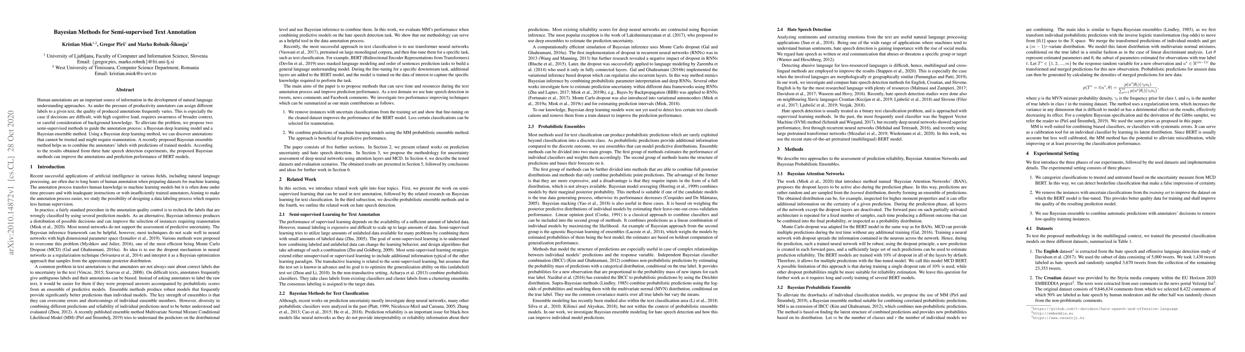 Human annotations are an important source of information in the development of natural language understanding approaches. As under the pressure of productivity annotators can assign different labels to a given text, the quality of produced annotations frequently varies. This is especially the case if decisions are difficult, with high cognitive load, requires awareness of broader context, or careful consideration of background knowledge. To alleviate the problem, we propose two semi-supervised methods to guide the annotation process: a Bayesian deep learning model and a Bayesian ensemble method. Using a Bayesian deep learning method, we can discover annotations that cannot be trusted and might require reannotation. A recently proposed Bayesian ensemble method helps us to combine the annotators' labels with predictions of trained models. According to the results obtained from three hate speech detection experiments, the proposed Bayesian methods can improve the annotations and prediction performance of BERT models.