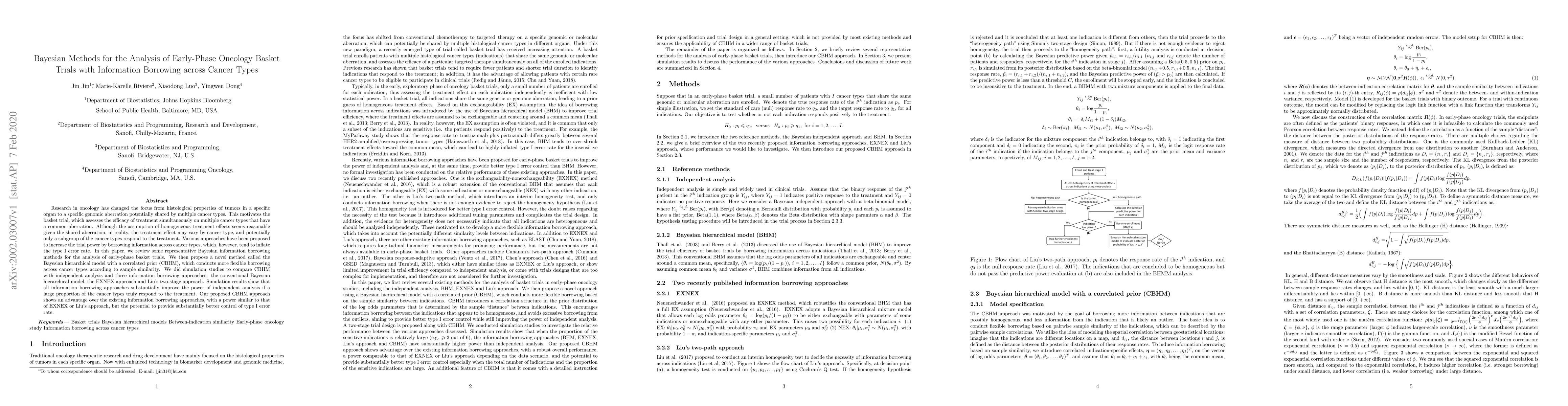 This paper reviews Bayesian methods for analyzing early-phase oncology basket trials, which assess treatment efficacy across multiple cancer types sharing a common genomic aberration. It proposes a novel Bayesian hierarchical model with a correlated prior (CBHM) that flexibly borrows information based on sample similarity, demonstrating improved control of type I error rates compared to existing methods.