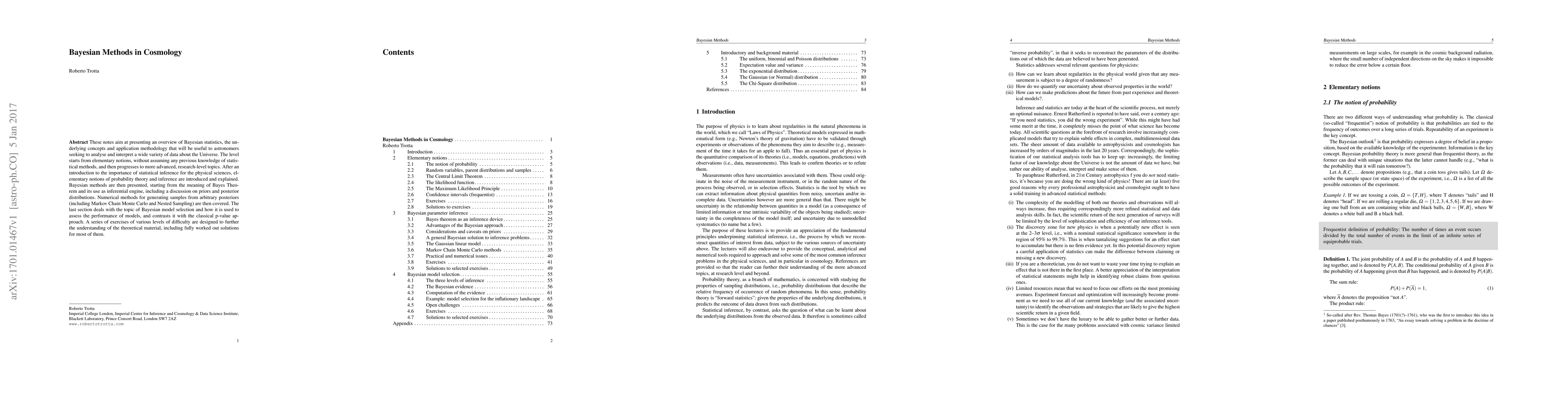 These notes aim at presenting an overview of Bayesian statistics, the underlying concepts and application methodology that will be useful to astronomers seeking to analyse and interpret a wide variety of data about the Universe. The level starts from elementary notions, without assuming any previous knowledge of statistical methods, and then progresses to more advanced, research-level topics. After an introduction to the importance of statistical inference for the physical sciences, elementary notions of probability theory and inference are introduced and explained. Bayesian methods are then presented, starting from the meaning of Bayes Theorem and its use as inferential engine, including a discussion on priors and posterior distributions. Numerical methods for generating samples from arbitrary posteriors (including Markov Chain Monte Carlo and Nested Sampling) are then covered. The last section deals with the topic of Bayesian model selection and how it is used to assess the performance of models, and contrasts it with the classical p-value approach. A series of exercises of various levels of difficulty are designed to further the understanding of the theoretical material, including fully worked out solutions for most of them.