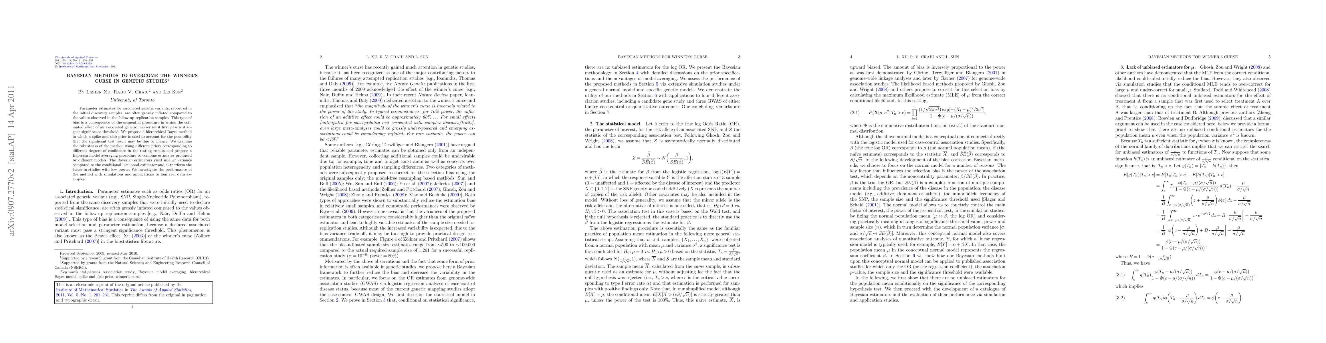 This paper proposes a hierarchical Bayesian method using a spike-and-slab prior to mitigate the winner's curse in genetic studies, where initial estimates are inflated. The method combines estimates from different models and shows reduced variance and better performance in low-power studies compared to traditional estimators.