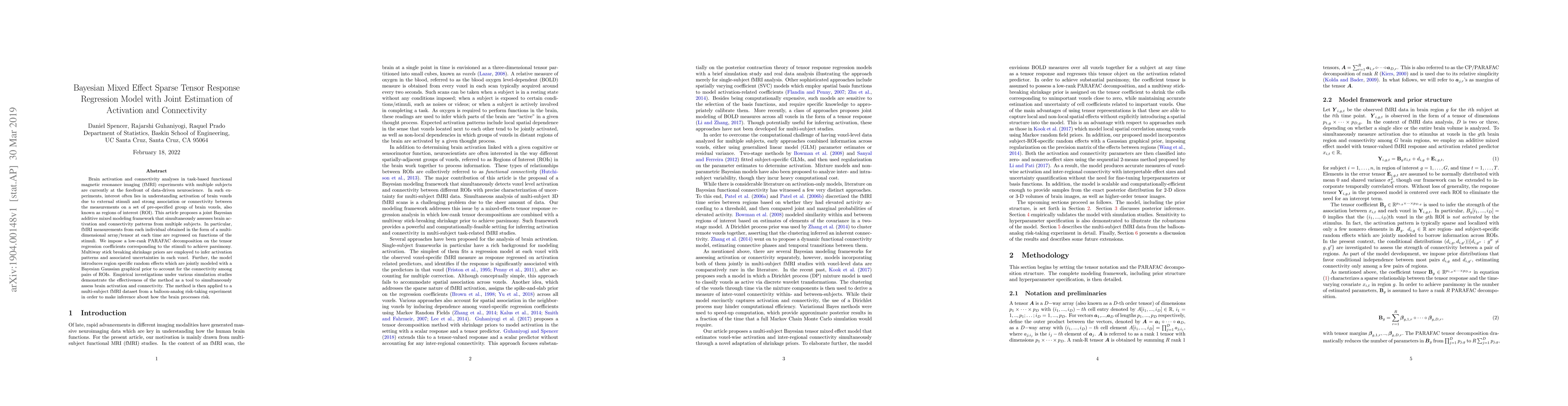 This paper proposes a Bayesian mixed effect sparse tensor regression model to jointly estimate brain activation and connectivity in fMRI data from multiple subjects. The model uses a low-rank PARAFAC decomposition and stick breaking shrinkage priors to infer activation patterns, while a Gaussian graphical prior accounts for connectivity among regions of interest. The method is validated through simulations and applied to a risk-taking fMRI dataset.