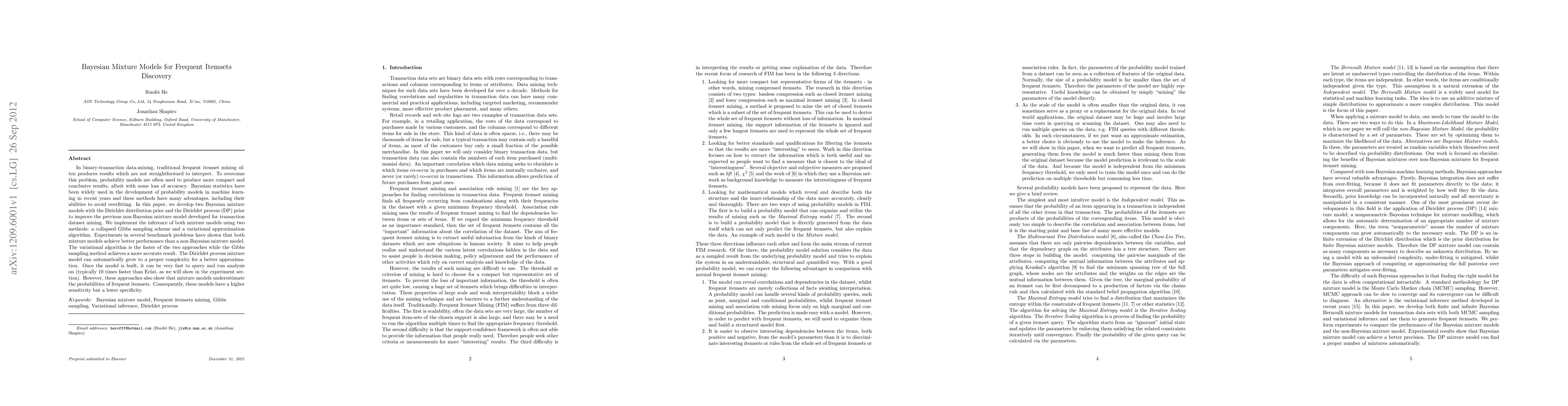 This paper develops two Bayesian mixture models—one with a Dirichlet distribution prior and another with a Dirichlet process prior—to improve frequent itemset discovery in binary-transaction data mining. Both models outperform a non-Bayesian counterpart, with the variational algorithm being faster and Gibbs sampling yielding more accurate results.