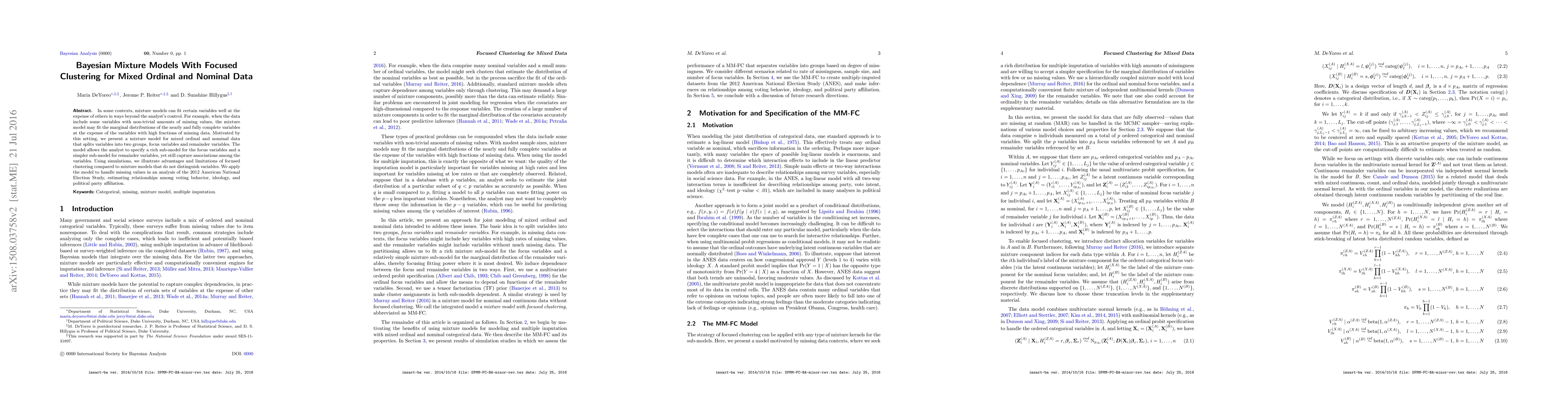 In some contexts, mixture models can fit certain variables well at the expense of others in ways beyond the analyst's control. For example, when the data include some variables with non-trivial amounts of missing values, the mixture model may fit the marginal distributions of the nearly and fully complete variables at the expense of the variables with high fractions of missing data. Motivated by this setting, we present a mixture model for mixed ordinal and nominal data that splits variables into two groups, focus variables and remainder variables. The model allows the analyst to specify a rich sub-model for the focus variables and a simpler sub-model for remainder variables, yet still capture associations among the variables. Using simulations, we illustrate advantages and limitations of focused clustering compared to mixture models that do not distinguish variables. We apply the model to handle missing values in an analysis of the 2012 American National Election Study, estimating relationships among voting behavior, ideology, and political party affiliation.