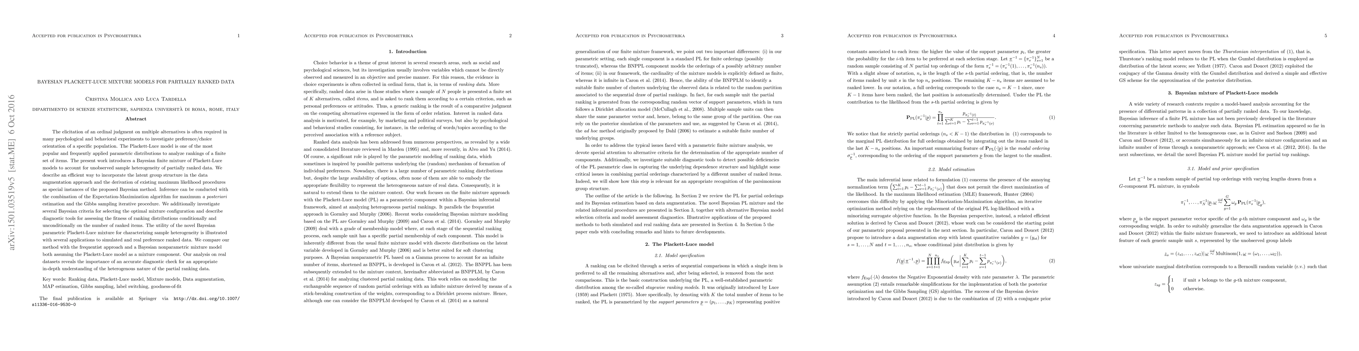 This paper introduces a Bayesian mixture of Plackett-Luce models to analyze partially ranked data, accounting for unobserved heterogeneity. It employs data augmentation and the Expectation-Maximization algorithm with Gibbs sampling for inference, and compares the method with frequentist and Bayesian nonparametric approaches.