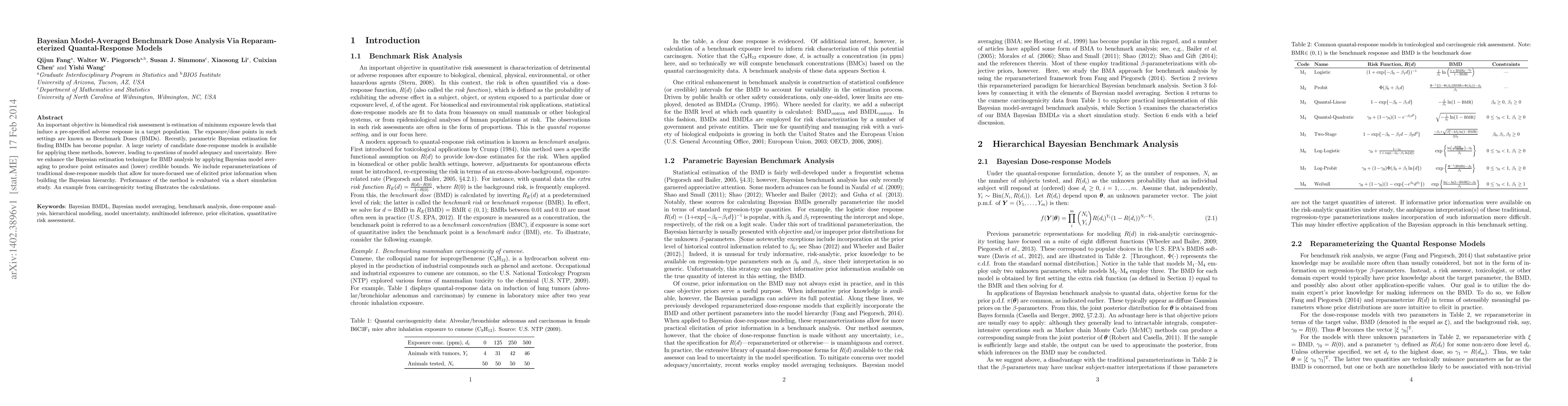 This paper proposes a Bayesian model-averaged approach for estimating Benchmark Doses (BMDs) using reparameterized quantal-response models, incorporating Bayesian model averaging to address model uncertainty and incorporating prior information for improved accuracy. The method is demonstrated through a simulation study and an example from carcinogenicity testing.