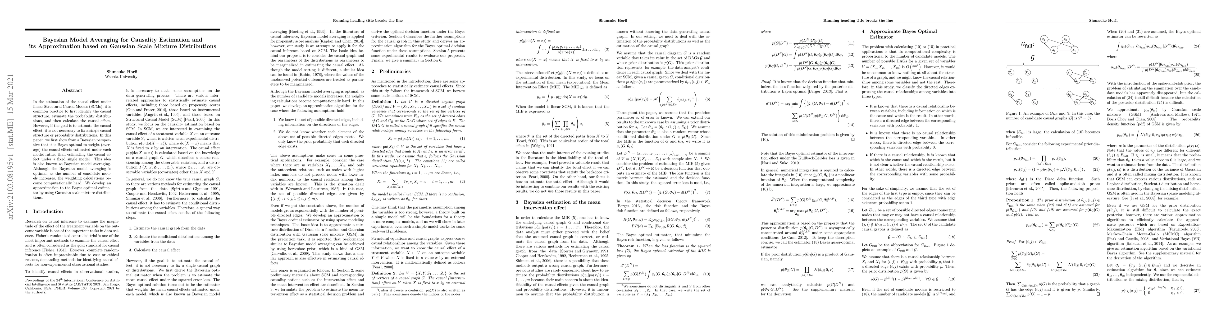 This paper proposes Bayesian model averaging for estimating causal effects in linear Structural Causal Models, arguing that averaging effects from multiple models is optimal. To address computational challenges with increasing model numbers, it introduces an approximation using Gaussian scale mixture distributions.