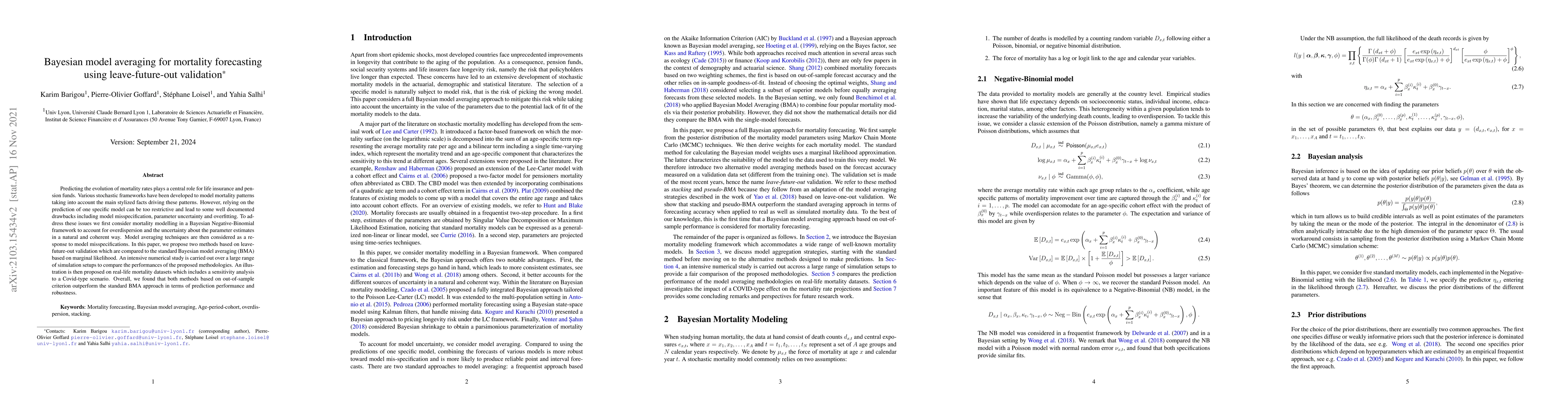 Predicting the evolution of mortality rates plays a central role for life insurance and pension funds.Various stochastic frameworks have been developed to model mortality patterns taking into account the main stylized facts driving these patterns. However, relying on the prediction of one specific model can be too restrictive and lead to some well documented drawbacks including model misspecification, parameter uncertainty and overfitting. To address these issues we first consider mortality modelling in a Bayesian Negative-Binomial framework to account for overdispersion and the uncertainty about the parameter estimates in a natural and coherent way. Model averaging techniques are then considered as a response to model misspecifications. In this paper, we propose two methods based on leave-future-out validation which are compared to the standard Bayesian model averaging (BMA) based on marginal likelihood. An intensive numerical study is carried out over a large range of simulation setups to compare the performances of the proposed methodologies. An illustration is then proposed on real-life mortality datasets which includes a sensitivity analysis to a Covid-type scenario. Overall, we found that both methods based on out-of-sample criterion outperform the standard BMA approach in terms of prediction performance and robustness.