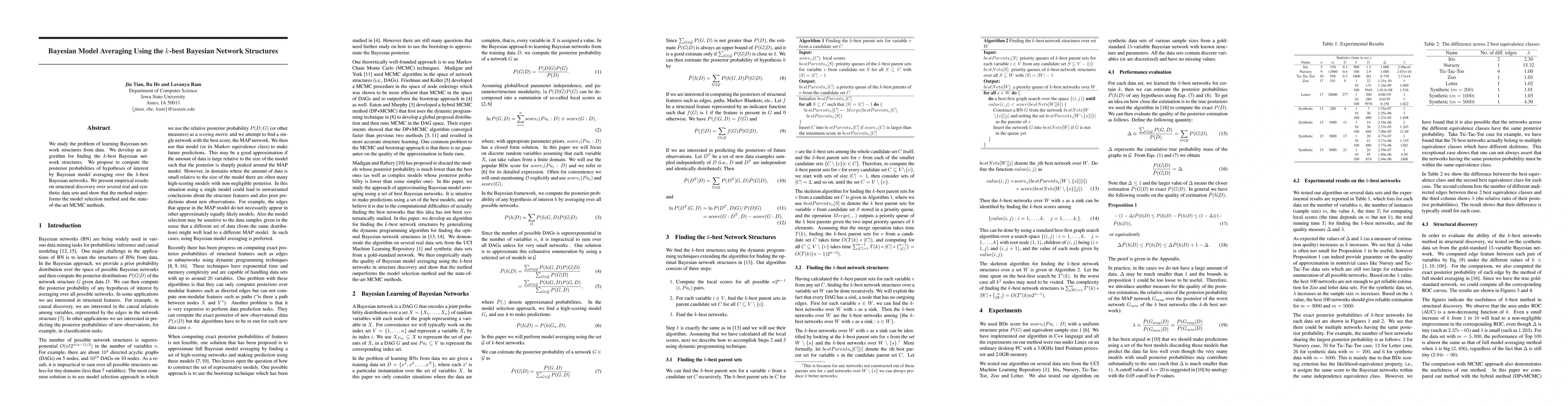 This paper develops an algorithm to identify the k-best Bayesian network structures and proposes Bayesian model averaging over these networks to compute posterior probabilities, demonstrating superior performance over traditional model selection and MCMC methods in empirical evaluations.