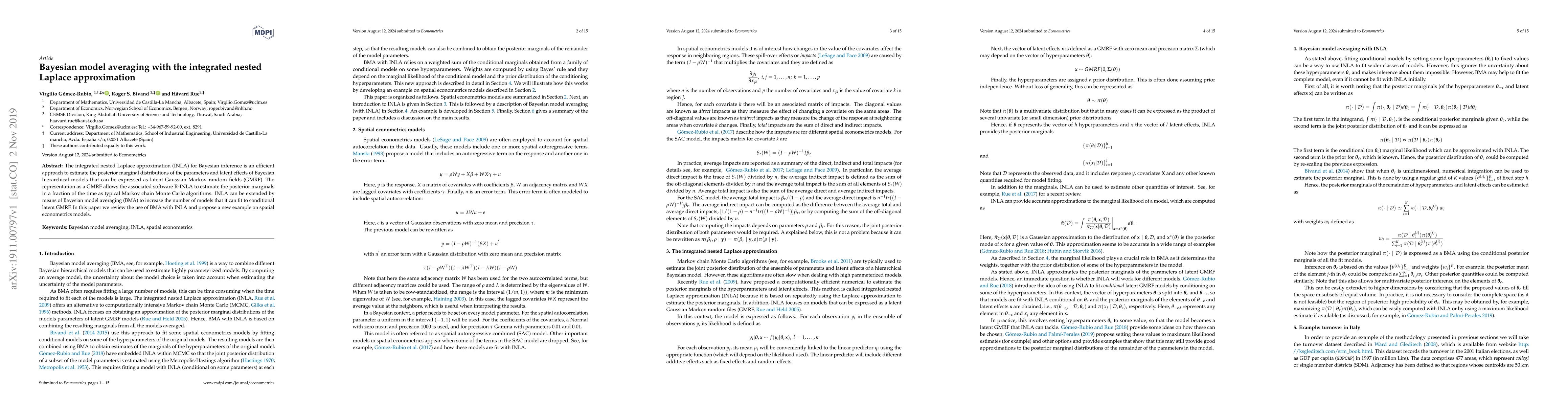 The integrated nested Laplace approximation (INLA) for Bayesian inference is an efficient approach to estimate the posterior marginal distributions of the parameters and latent effects of Bayesian hierarchical models that can be expressed as latent Gaussian Markov random fields (GMRF). The representation as a GMRF allows the associated software R-INLA to estimate the posterior marginals in a fraction of the time as typical Markov chain Monte Carlo algorithms. INLA can be extended by means of Bayesian model averaging (BMA) to increase the number of models that it can fit to conditional latent GMRF. In this paper we review the use of BMA with INLA and propose a new example on spatial econometrics models.