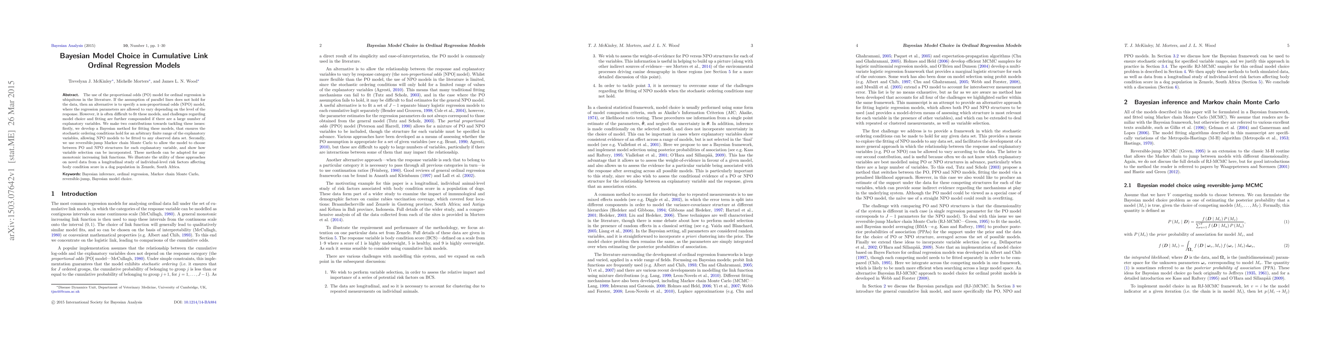 The use of the proportional odds (PO) model for ordinal regression is ubiquitous in the literature. If the assumption of parallel lines does not hold for the data, then an alternative is to specify a non-proportional odds (NPO) model, where the regression parameters are allowed to vary depending on the level of the response. However, it is often difficult to fit these models, and challenges regarding model choice and fitting are further compounded if there are a large number of explanatory variables. We make two contributions towards tackling these issues: firstly, we develop a Bayesian method for fitting these models, that ensures the stochastic ordering conditions hold for an arbitrary finite range of the explanatory variables, allowing NPO models to be fitted to any observed data set. Secondly, we use reversible-jump Markov chain Monte Carlo to allow the model to choose between PO and NPO structures for each explanatory variable, and show how variable selection can be incorporated. These methods can be adapted for any monotonic increasing link functions. We illustrate the utility of these approaches on novel data from a longitudinal study of individual-level risk factors affecting body condition score in a dog population in Zenzele, South Africa.