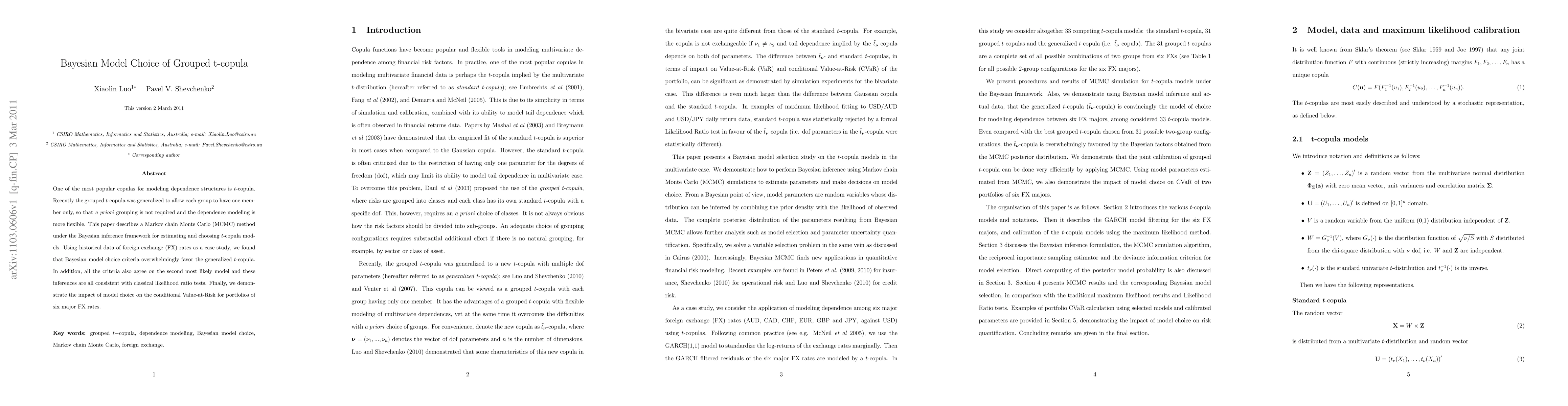 This paper proposes a Bayesian MCMC method for estimating and selecting grouped t-copula models, demonstrating its effectiveness using historical foreign exchange rate data. The results show that Bayesian model choice criteria strongly favor the generalized t-copula, with consistent inferences from classical likelihood ratio tests, and highlight the model's impact on portfolio risk assessment.