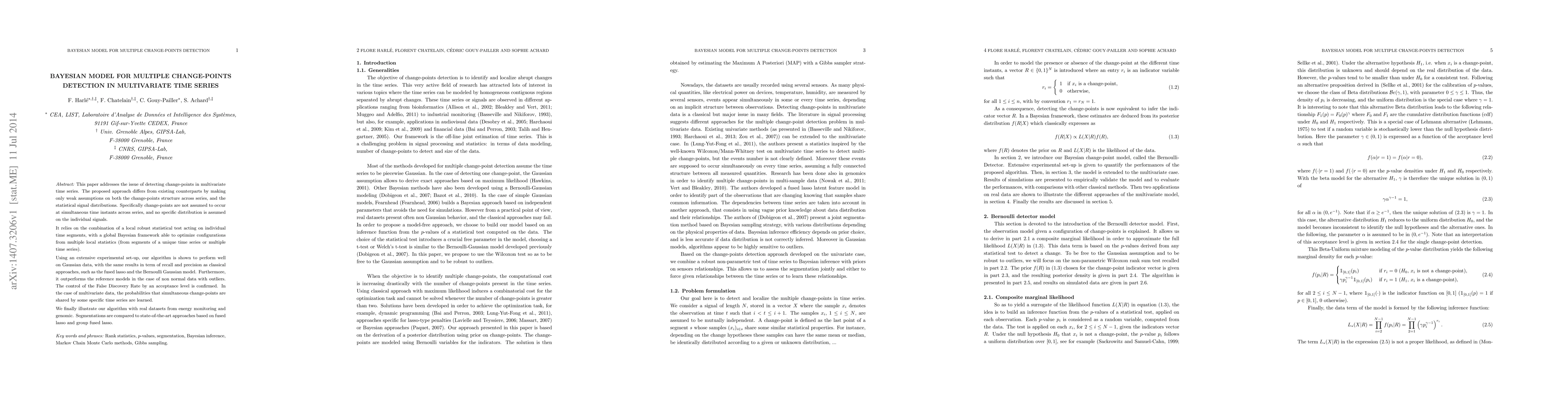This paper addresses the issue of detecting change-points in multivariate time series. The proposed approach differs from existing counterparts by making only weak assumptions on both the change-points structure across series, and the statistical signal distributions. Specifically change-points are not assumed to occur at simultaneous time instants across series, and no specific distribution is assumed on the individual signals. It relies on the combination of a local robust statistical test acting on individual time segments, with a global Bayesian framework able to optimize configurations from multiple local statistics (from segments of a unique time series or multiple time series). Using an extensive experimental set-up, our algorithm is shown to perform well on Gaussian data, with the same results in term of recall and precision as classical approaches, such as the fused lasso and the Bernoulli Gaussian model. Furthermore, it outperforms the reference models in the case of non normal data with outliers. The control of the False Discovery Rate by an acceptance level is confirmed. In the case of multivariate data, the probabilities that simultaneous change-points are shared by some specific time series are learned. We finally illustrate our algorithm with real datasets from energy monitoring and genomic. Segmentations are compared to state-of-the-art approaches based on fused lasso and group fused lasso.