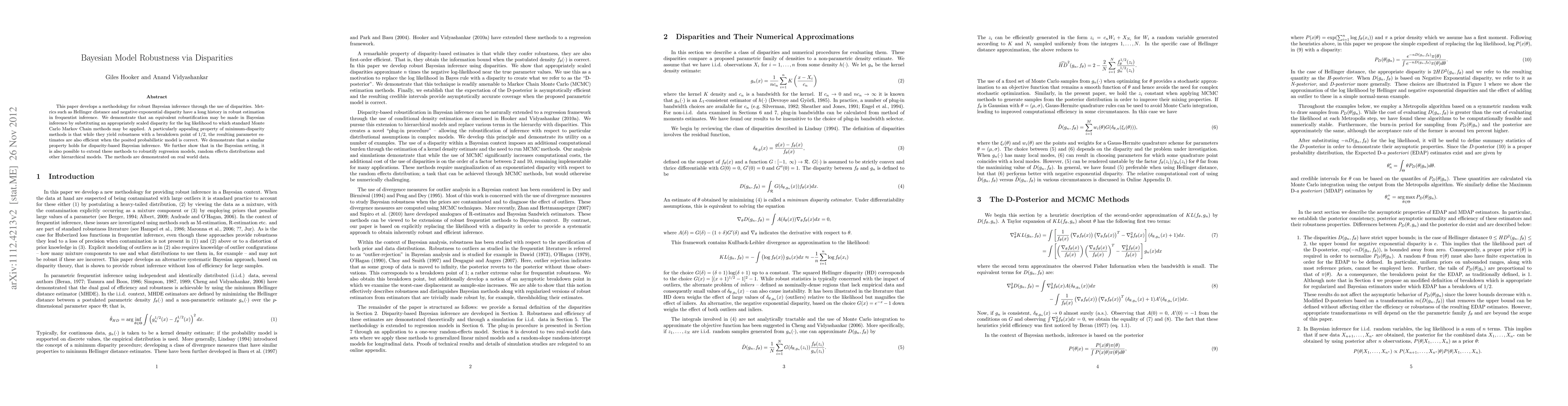 Researchers develop a method for robust Bayesian inference using disparities, which provide efficient estimates while maintaining robustness in probabilistic models. The approach extends to regression models, hierarchical models, and real-world data applications.
