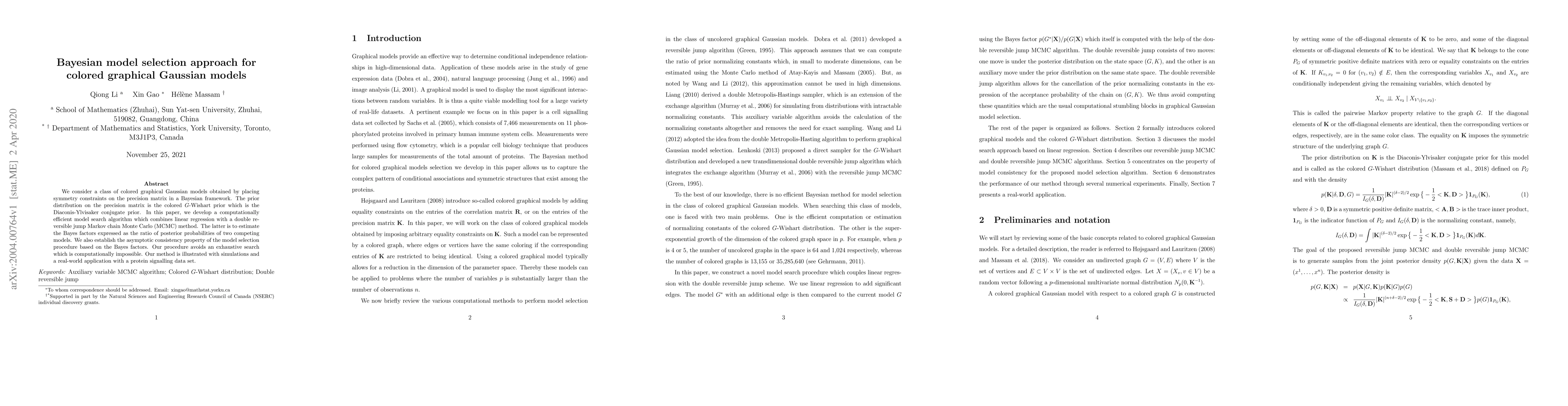 This paper proposes a Bayesian model selection method for colored graphical Gaussian models using a colored $G$-Wishart prior. It introduces an efficient algorithm combining linear regression with a double reversible jump MCMC to estimate Bayes factors, demonstrating asymptotic consistency and avoiding exhaustive search. The method is validated through simulations and applied to protein signaling data.