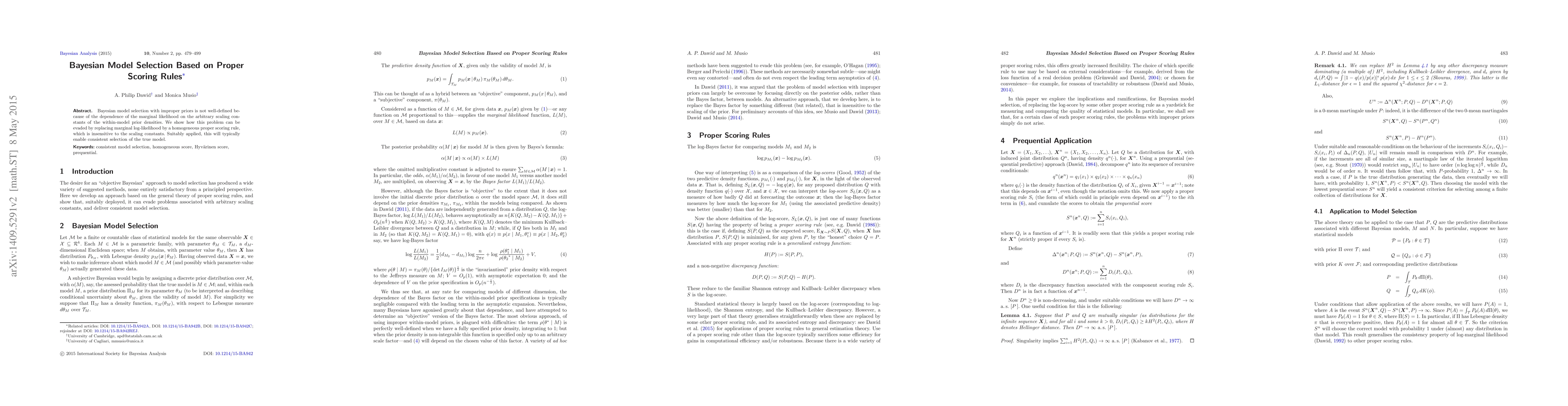 This paper discusses Bayesian model selection using proper scoring rules to avoid issues arising from improper priors, demonstrating that proper scoring rules are invariant to scaling constants, thus providing a consistent method for selecting the true model.
