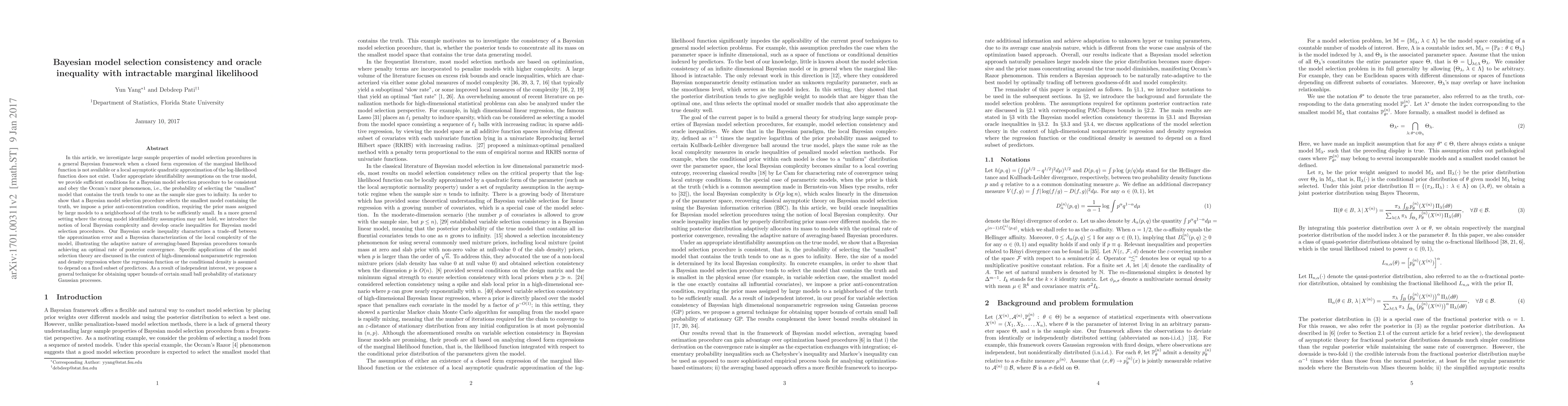 In this article, we investigate large sample properties of model selection procedures in a general Bayesian framework when a closed form expression of the marginal likelihood function is not available or a local asymptotic quadratic approximation of the log-likelihood function does not exist. Under appropriate identifiability assumptions on the true model, we provide sufficient conditions for a Bayesian model selection procedure to be consistent and obey the Occam's razor phenomenon, i.e., the probability of selecting the "smallest" model that contains the truth tends to one as the sample size goes to infinity. In order to show that a Bayesian model selection procedure selects the smallest model containing the truth, we impose a prior anti-concentration condition, requiring the prior mass assigned by large models to a neighborhood of the truth to be sufficiently small. In a more general setting where the strong model identifiability assumption may not hold, we introduce the notion of local Bayesian complexity and develop oracle inequalities for Bayesian model selection procedures. Our Bayesian oracle inequality characterizes a trade-off between the approximation error and a Bayesian characterization of the local complexity of the model, illustrating the adaptive nature of averaging-based Bayesian procedures towards achieving an optimal rate of posterior convergence. Specific applications of the model selection theory are discussed in the context of high-dimensional nonparametric regression and density regression where the regression function or the conditional density is assumed to depend on a fixed subset of predictors. As a result of independent interest, we propose a general technique for obtaining upper bounds of certain small ball probability of stationary Gaussian processes.