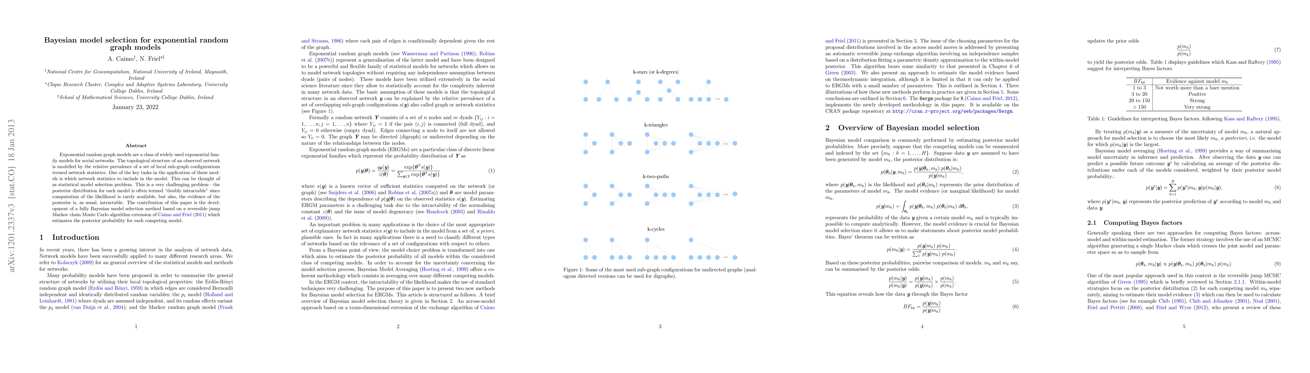 This paper develops a fully Bayesian model selection method for exponential random graph models using a reversible jump Markov chain Monte Carlo algorithm to estimate the posterior probability of competing models, addressing the challenge of intractable likelihood and posterior evidence.