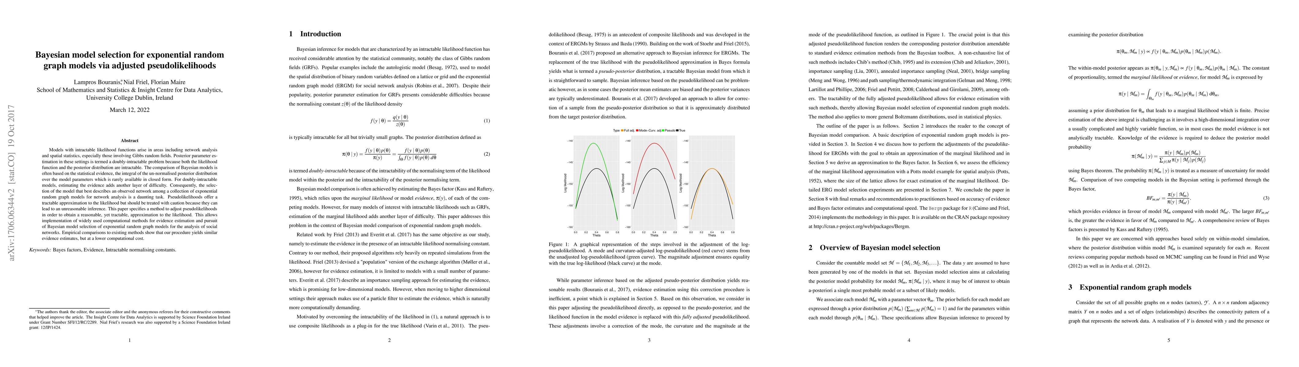 Models with intractable likelihood functions arise in areas including network analysis and spatial statistics, especially those involving Gibbs random fields. Posterior parameter es timation in these settings is termed a doubly-intractable problem because both the likelihood function and the posterior distribution are intractable. The comparison of Bayesian models is often based on the statistical evidence, the integral of the un-normalised posterior distribution over the model parameters which is rarely available in closed form. For doubly-intractable models, estimating the evidence adds another layer of difficulty. Consequently, the selection of the model that best describes an observed network among a collection of exponential random graph models for network analysis is a daunting task. Pseudolikelihoods offer a tractable approximation to the likelihood but should be treated with caution because they can lead to an unreasonable inference. This paper specifies a method to adjust pseudolikelihoods in order to obtain a reasonable, yet tractable, approximation to the likelihood. This allows implementation of widely used computational methods for evidence estimation and pursuit of Bayesian model selection of exponential random graph models for the analysis of social networks. Empirical comparisons to existing methods show that our procedure yields similar evidence estimates, but at a lower computational cost.