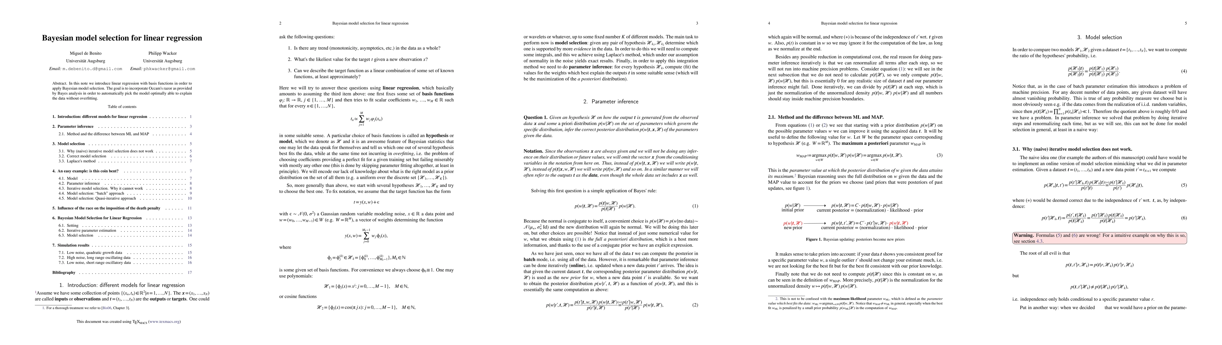 In this note we introduce linear regression with basis functions in order to apply Bayesian model selection. The goal is to incorporate Occam's razor as provided by Bayes analysis in order to automatically pick the model optimally able to explain the data without overfitting.