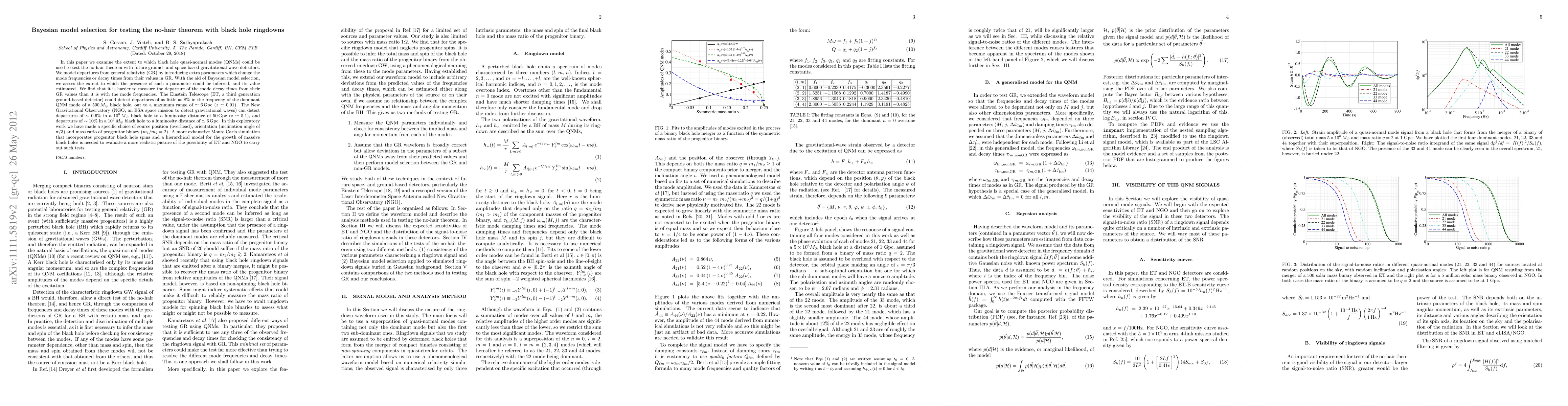 This paper uses Bayesian model selection to test the no-hair theorem by analyzing black hole ringdowns from gravitational waves, finding that future detectors like the Einstein Telescope and New Gravitational Observatory can detect small deviations in quasi-normal mode frequencies, but not as easily in decay times.