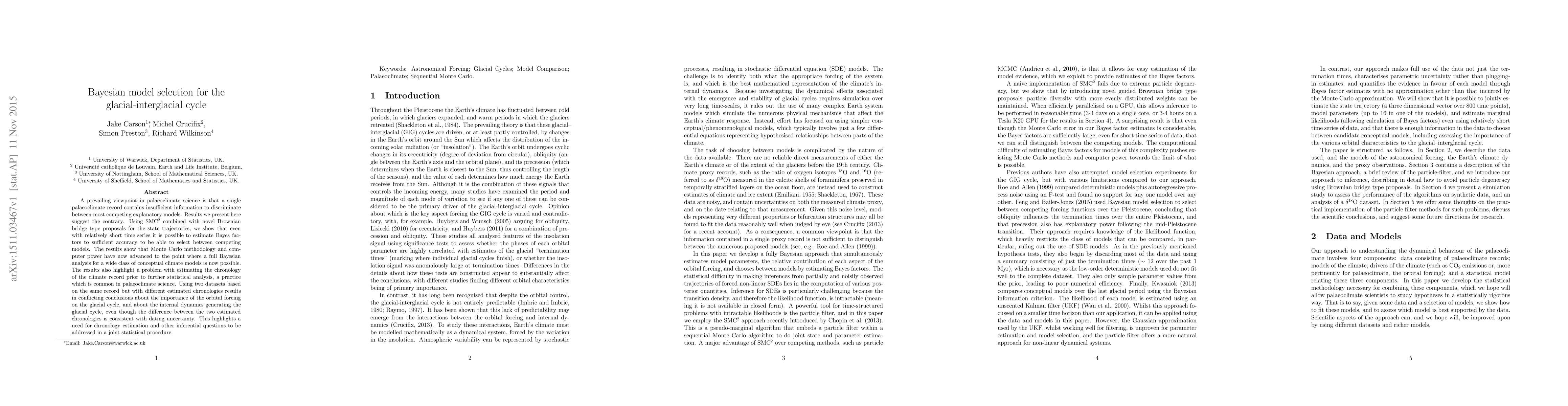 A prevailing viewpoint in palaeoclimate science is that a single palaeoclimate record contains insufficient information to discriminate between most competing explanatory models. Results we present here suggest the contrary. Using SMC^2 combined with novel Brownian bridge type proposals for the state trajectories, we show that even with relatively short time series it is possible to estimate Bayes factors to sufficient accuracy to be able to select between competing models. The results show that Monte Carlo methodology and computer power have now advanced to the point where a full Bayesian analysis for a wide class of conceptual climate models is now possible. The results also highlight a problem with estimating the chronology of the climate record prior to further statistical analysis, a practice which is common in palaeoclimate science. Using two datasets based on the same record but with different estimated chronologies results in conflicting conclusions about the importance of the orbital forcing on the glacial cycle, and about the internal dynamics generating the glacial cycle, even though the difference between the two estimated chronologies is consistent with dating uncertainty. This highlights a need for chronology estimation and other inferential questions to be addressed in a joint statistical procedure.