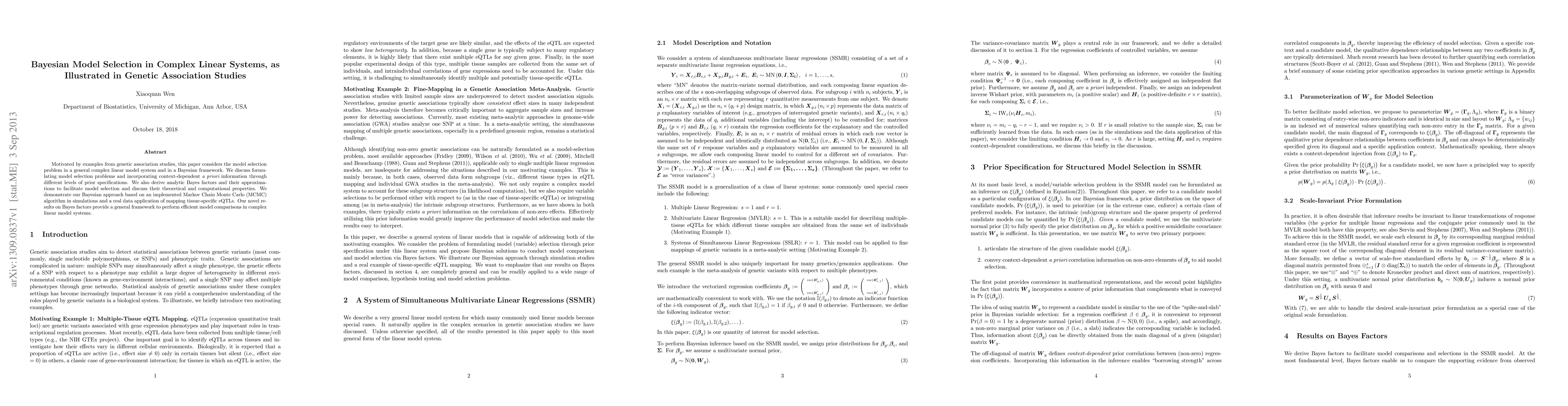 This paper proposes a Bayesian framework for model selection in complex linear systems, particularly in genetic association studies. It introduces analytic Bayes factors and their approximations to facilitate efficient model comparisons, demonstrated through simulations and a real data application on tissue-specific eQTL mapping.