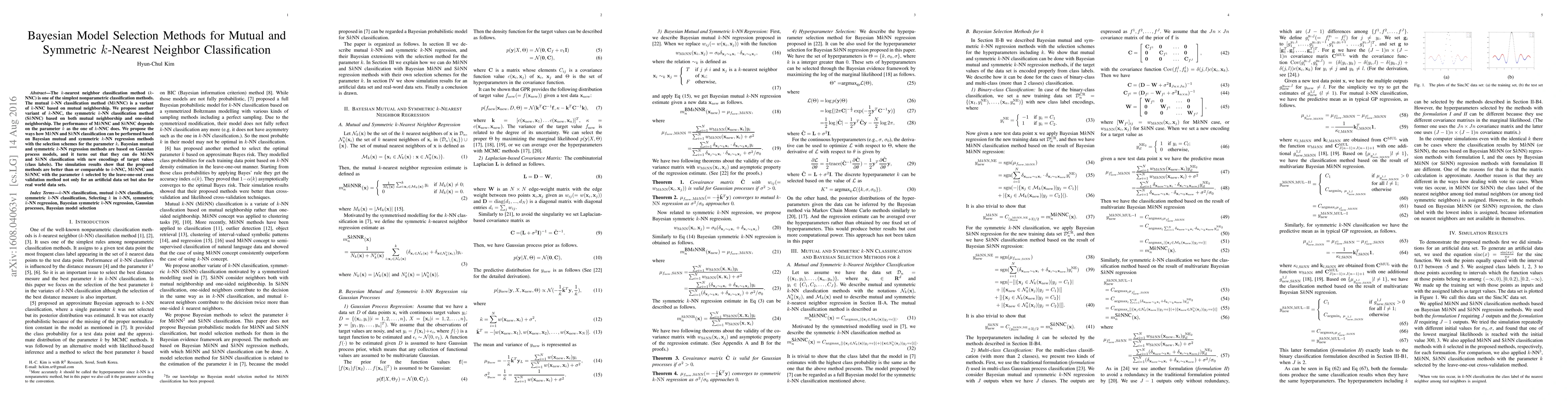 This paper proposes Bayesian model selection methods for mutual and symmetric $k$-nearest neighbor classification, introducing variants M$k$NNC and S$k$NNC based on mutual and symmetric neighborship. The performance of these methods is enhanced by Bayesian regression techniques and Gaussian process models, with simulation results indicating superior or comparable performance to traditional $k$-NNC methods.