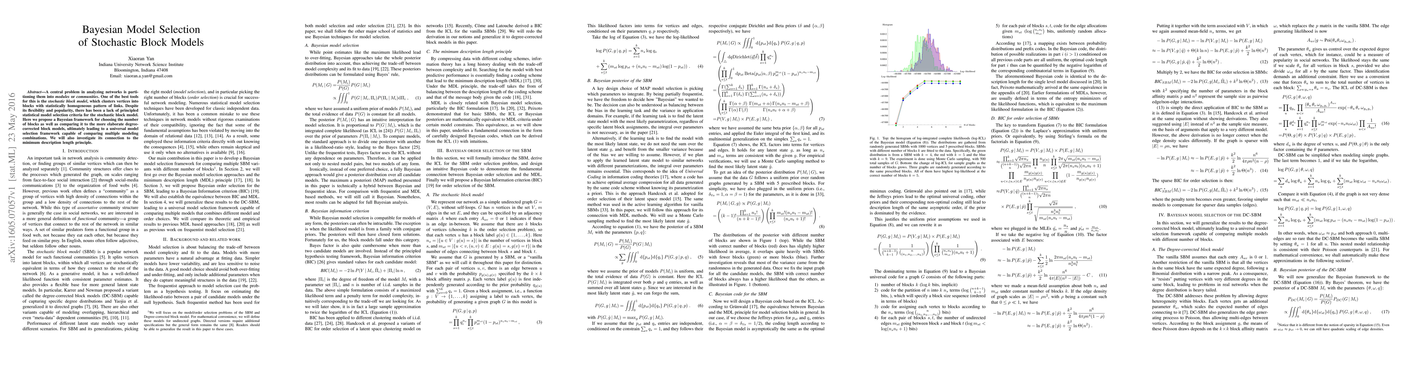 A central problem in analyzing networks is partitioning them into modules or communities. One of the best tools for this is the stochastic block model, which clusters vertices into blocks with statistically homogeneous pattern of links. Despite its flexibility and popularity, there has been a lack of principled statistical model selection criteria for the stochastic block model. Here we propose a Bayesian framework for choosing the number of blocks as well as comparing it to the more elaborate degree- corrected block models, ultimately leading to a universal model selection framework capable of comparing multiple modeling combinations. We will also investigate its connection to the minimum description length principle.