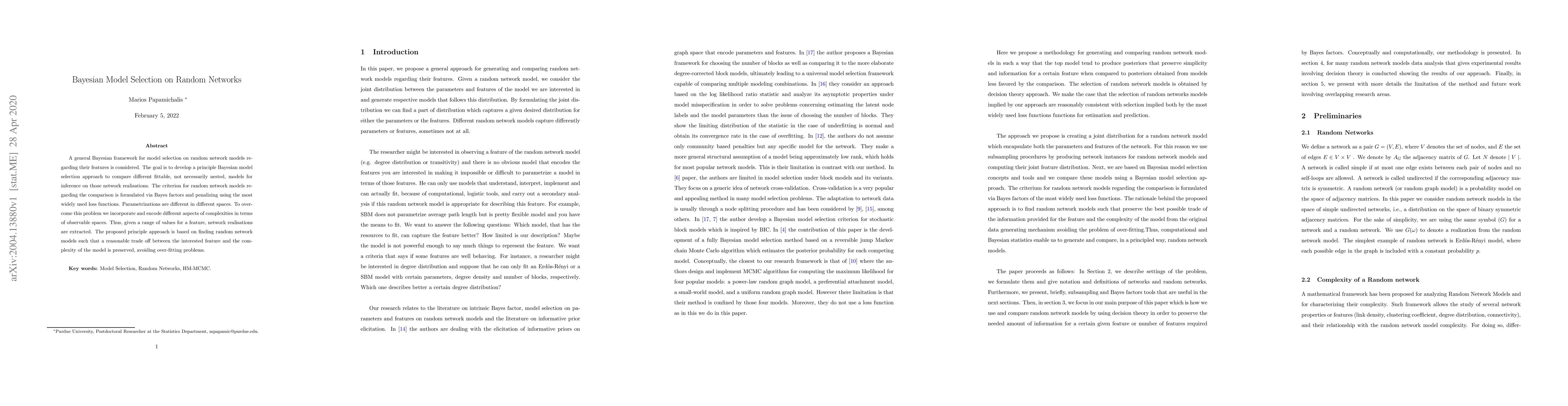 A general Bayesian framework for model selection on random network models regarding their features is considered. The goal is to develop a principle Bayesian model selection approach to compare different fittable, not necessarily nested, models for inference on those network realisations. The criterion for random network models regarding the comparison is formulated via Bayes factors and penalizing using the mostwidely used loss functions. Parametrizations are different in different spaces. To overcome this problem we incorporate and encode different aspects of complexities in terms of observable spaces. Thus, given a range of values for a feature, network realisationsare extracted. The proposed principle approach is based on finding random network models, such that a reasonable trade off between the interested feature and the complexity of the model is preserved, avoiding overfitting problems.