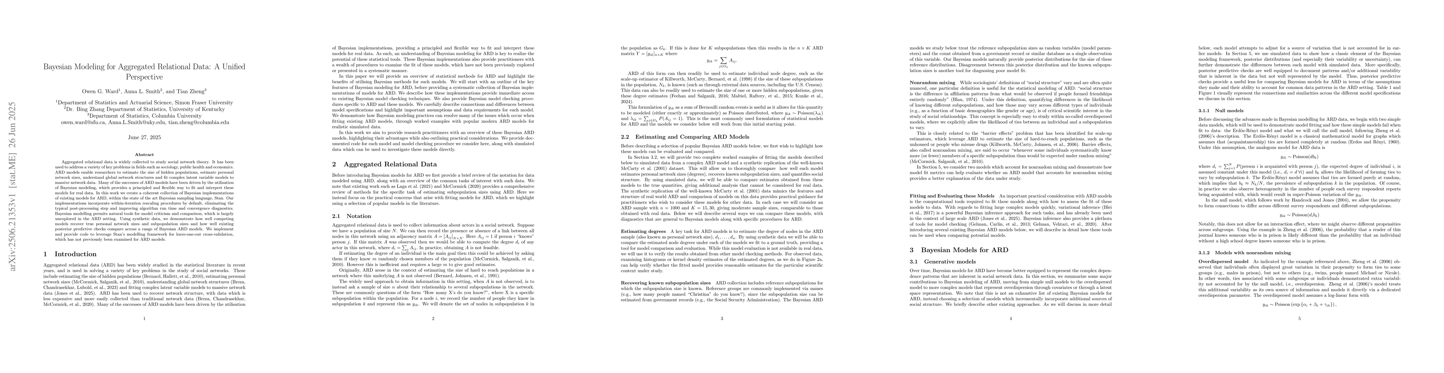 Aggregated relational data is widely collected to study social network theory. It has been used to address a variety of key problems in fields such as sociology, public health and economics. ARD models enable researchers to estimate the size of hidden populations, estimate personal network sizes, understand global network structures and fit complex latent variable models to massive network data. Many of the successes of ARD models have been driven by the utilisation of Bayesian modeling, which provides a principled and flexible way to fit and interpret these models for real data. In this work we create a coherent collection of Bayesian implementations of existing models for ARD, within the state of the art Bayesian sampling language, Stan. Our implementations incorporate within-iteration rescaling procedures by default, eliminating the typical post-processing step and improving algorithm run time and convergence diagnostics. Bayesian modelling permits natural tools for model criticism and comparison, which is largely unexplored in the ARD setting. Using synthetic data, we demonstrate how well competing models recover true personal network sizes and subpopulation sizes and how well existing posterior predictive checks compare across a range of Bayesian ARD models. We implement and provide code to leverage Stan's modelling framework for leave-one-out cross-validation, which has not previously been examined for ARD models.