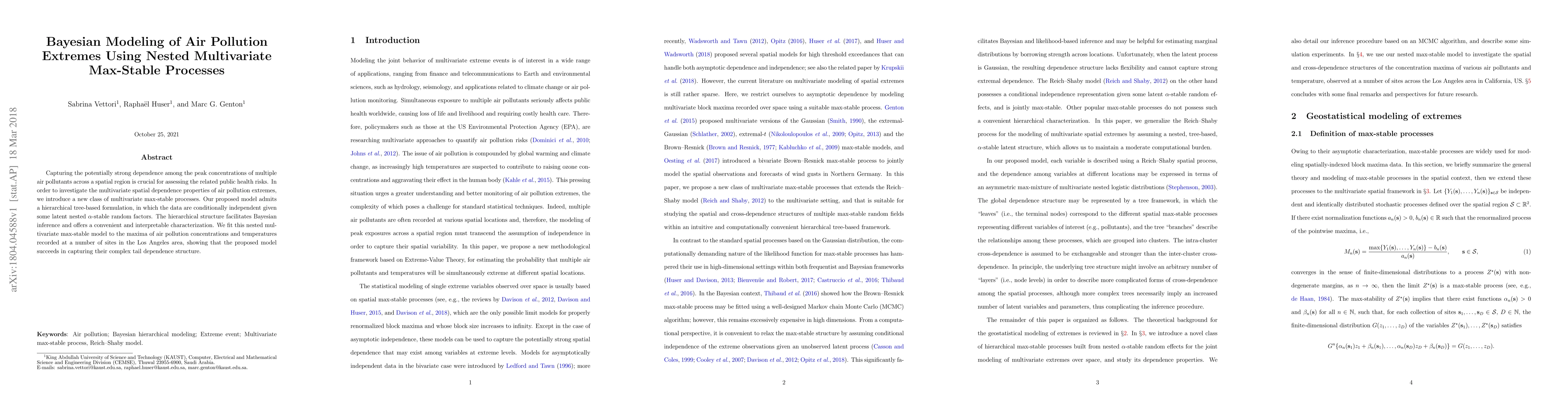This paper proposes a new class of nested multivariate max-stable processes to model the spatial dependence of extreme air pollution concentrations. The hierarchical Bayesian model captures complex tail dependence and is successfully applied to data from Los Angeles, demonstrating its effectiveness.