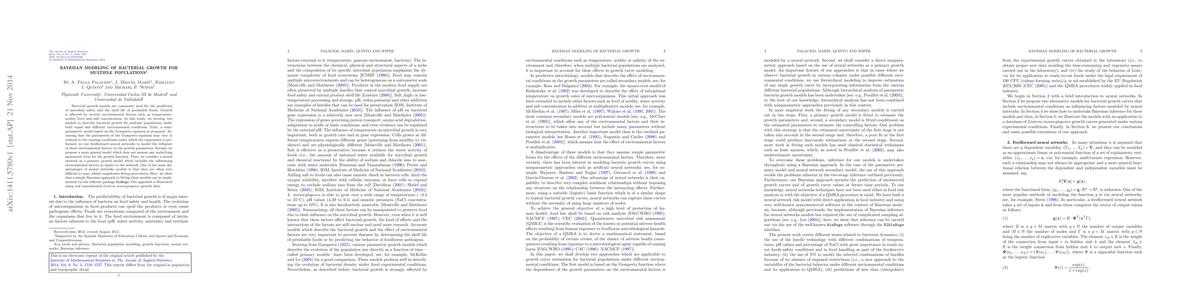 Bacterial growth models are commonly used for the prediction of microbial safety and the shelf life of perishable foods. Growth is affected by several environmental factors such as temperature, acidity level and salt concentration. In this study, we develop two models to describe bacterial growth for multiple populations under both equal and different environmental conditions. First, a semi-parametric model based on the Gompertz equation is proposed. Assuming that the parameters of the Gompertz equation may vary in relation to the running conditions under which the experiment is performed, we use feedforward neural networks to model the influence of these environmental factors on the growth parameters. Second, we propose a more general model which does not assume any underlying parametric form for the growth function. Thus, we consider a neural network as a primary growth model which includes the influencing environmental factors as inputs to the network. One of the main disadvantages of neural networks models is that they are often very difficult to tune, which complicates fitting procedures. Here, we show that a simple Bayesian approach to fitting these models can be implemented via the software package WinBugs. Our approach is illustrated using real experimental Listeria monocytogenes growth data.