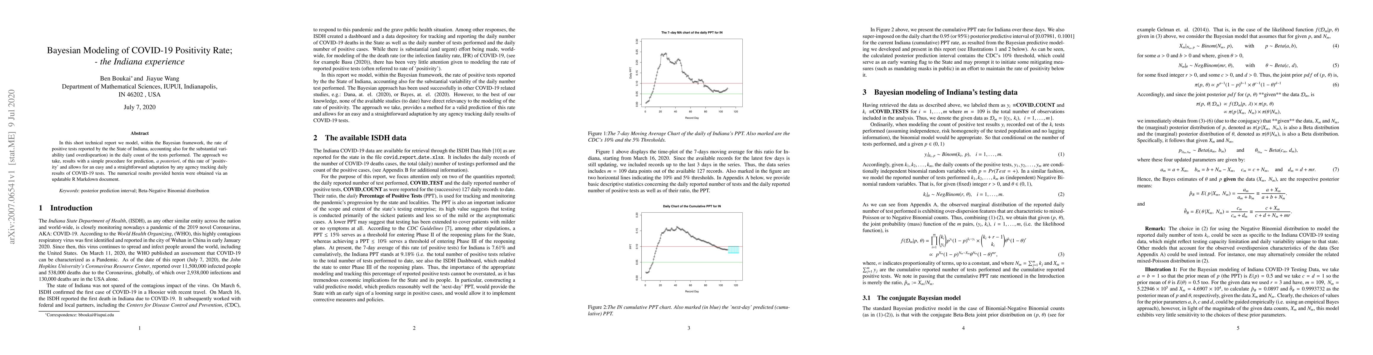In this short technical report we model, within the Bayesian framework, the rate of positive tests reported by the the State of Indiana, accounting also for the substantial variability (and overdispeartion) in the daily count of the tests performed. The approach we take, results with a simple procedure for prediction, a posteriori, of this rate of 'positivity' and allows for an easy and a straightforward adaptation by any agency tracking daily results of COVID-19 tests. The numerical results provided herein were obtained via an updatable R Markdown document.