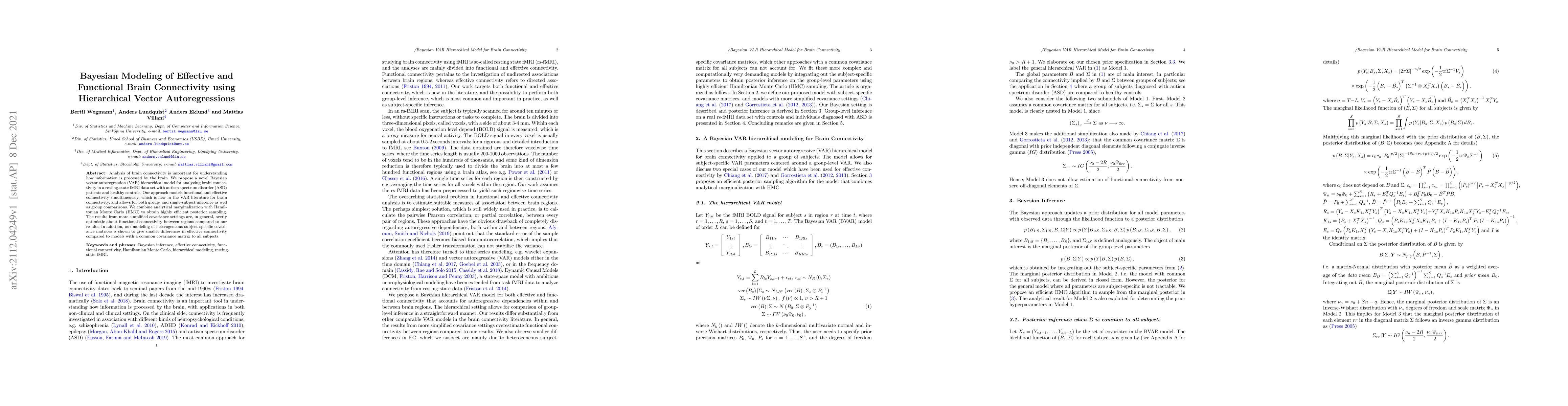 This paper proposes a Bayesian hierarchical vector autoregression model to analyze brain connectivity in resting-state fMRI data, distinguishing between functional and effective connectivity in ASD patients and healthy controls. The model allows for both group and individual subject analysis, and demonstrates more accurate connectivity estimates than simpler models.