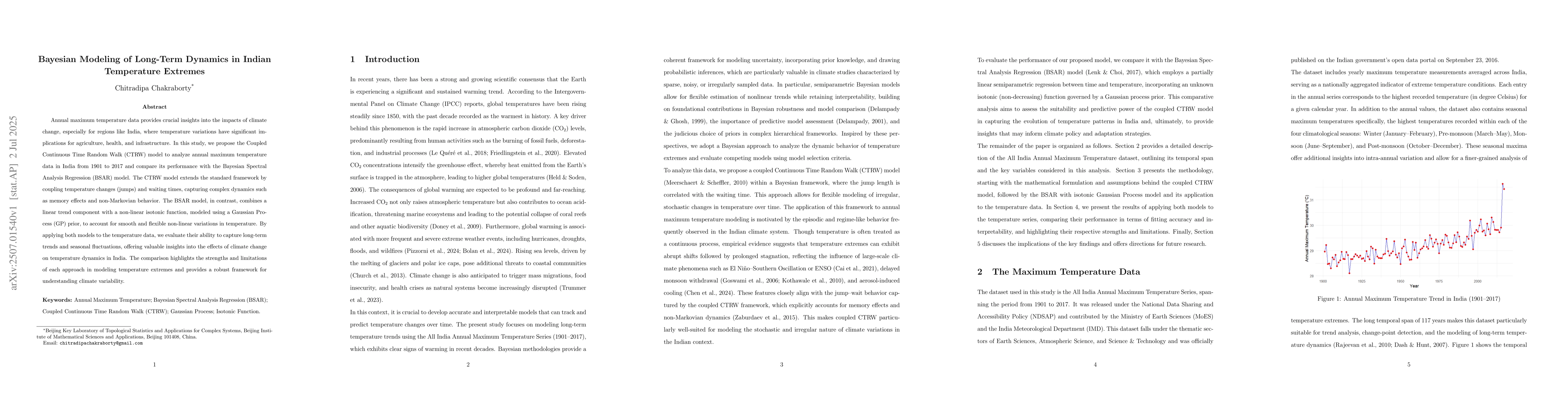 Annual maximum temperature data provides crucial insights into the impacts of climate change, especially for regions like India, where temperature variations have significant implications for agriculture, health, and infrastructure. In this study, we propose the Coupled Continuous Time Random Walk (CTRW) model to analyze annual maximum temperature data in India from 1901 to 2017 and compare its performance with the Bayesian Spectral Analysis Regression (BSAR) model. The CTRW model extends the standard framework by coupling temperature changes (jumps) and waiting times, capturing complex dynamics such as memory effects and non-Markovian behavior. The BSAR model, in contrast, combines a linear trend component with a non-linear isotonic function, modeled using a Gaussian Process (GP) prior, to account for smooth and flexible non-linear variations in temperature. By applying both models to the temperature data, we evaluate their ability to capture long-term trends and seasonal fluctuations, offering valuable insights into the effects of climate change on temperature dynamics in India. The comparison highlights the strengths and limitations of each approach in modeling temperature extremes and provides a robust framework for understanding climate variability.