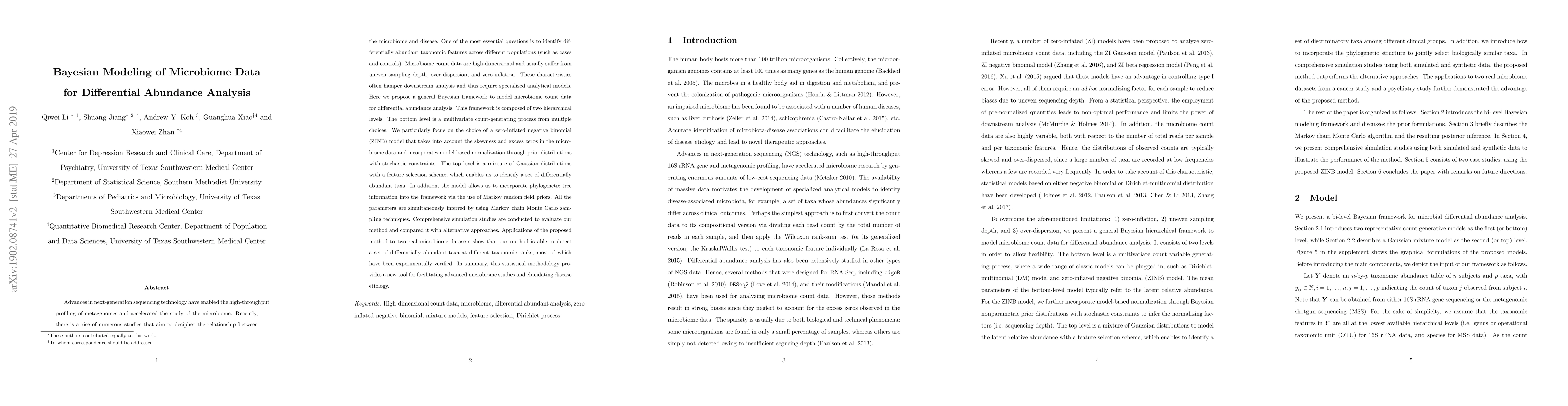 This paper proposes a Bayesian hierarchical modeling framework to analyze microbiome data for differential abundance analysis, addressing challenges like uneven sampling depth and overdispersion. The model uses a zero-inflated negative binomial approach and Gaussian mixture models to detect differentially abundant taxa, demonstrating improved performance through simulations and real-data applications.
